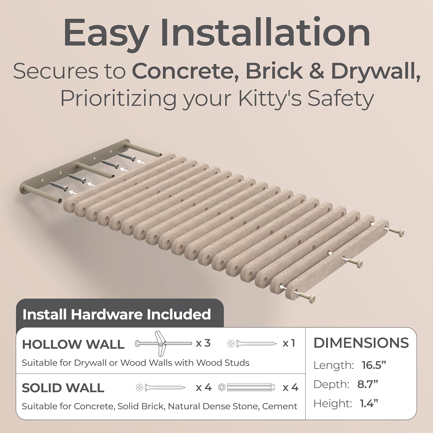 • Effortless Paradise: This cat wall bed includes all hardware, allowing your fur-baby to start exploring right away. Our cat climbing shelf securely attaches to concrete, cement, brick, dry wall and more ensuring your cat’s safety.