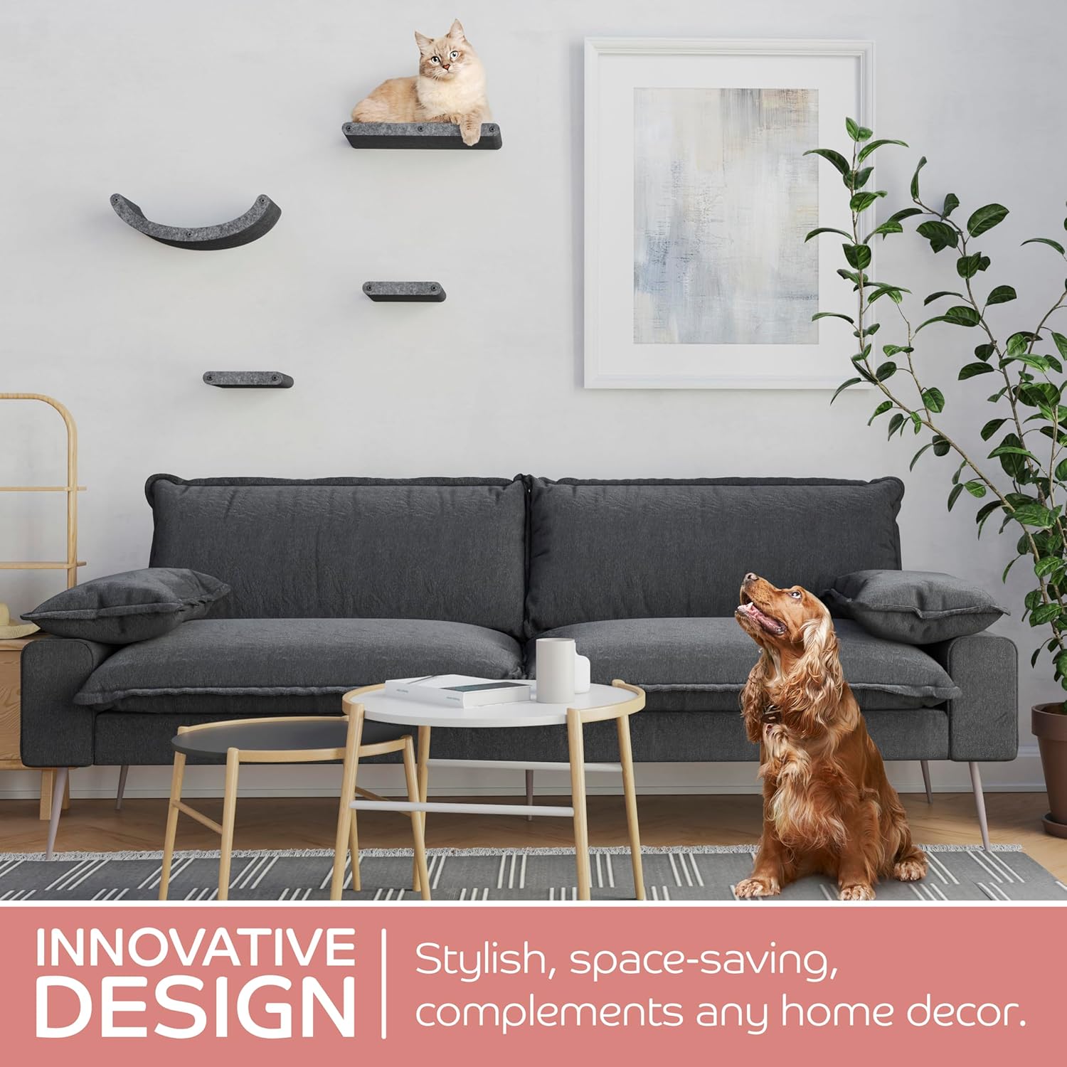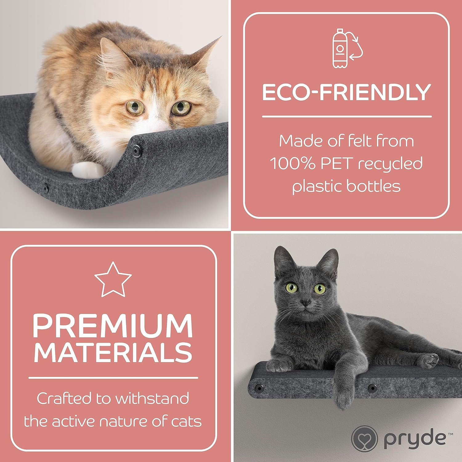 - INNOVATIVE AND SUSTAINABLE | Soft to the touch, firm in structure, and very tactile – cats love it! Our patent-pending cat shelf material is acoustic felt which is made from 100% Recycled PET bottles! It's built to withstand extended wear and tear.
