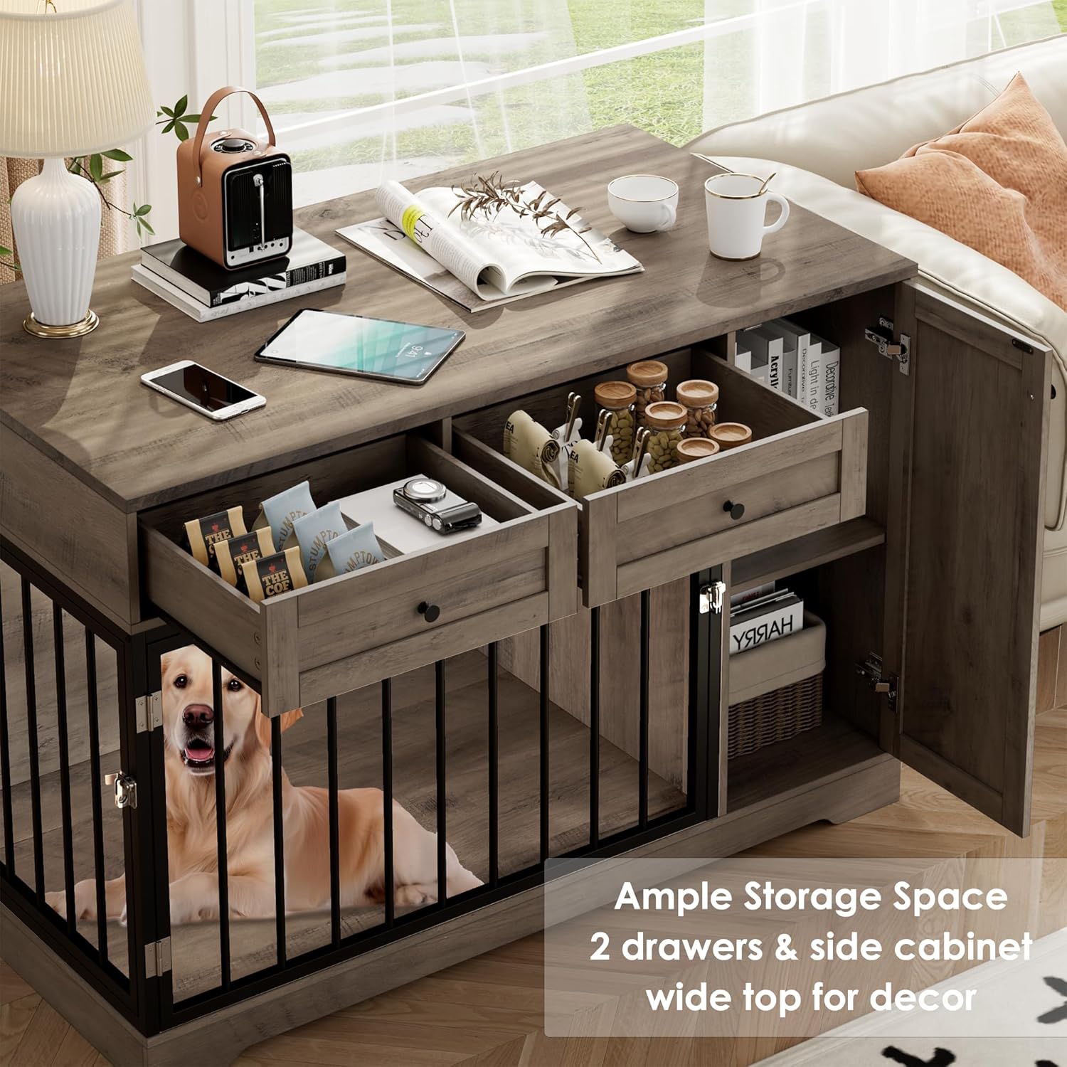 • Dog cage sideboard with storage: 47”X24” massive table top allows to place some decorations. 2 drawers and a spacious cabinet with shelf provide extra storage space for pet items such as dog toys, snacks, food etc. This dog kennel sideboard with drawers is functioning furniture for owners of small and medium-sized dogs, who apart from the comfort of pets, also care about the interior design.