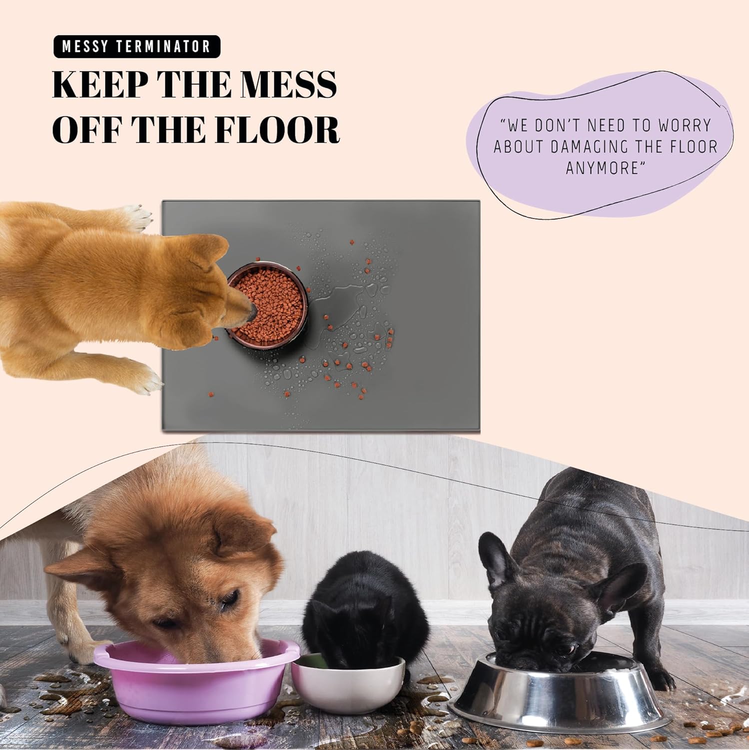 - Floor Protection: Protect your wood floor with our waterproof dog feeding mat. Thick and durable, this mat shields against spills and stains from dog or cat food and water bowls. Say goodbye to mildew worries. Ideal for pet owners who value clean and pristine floors