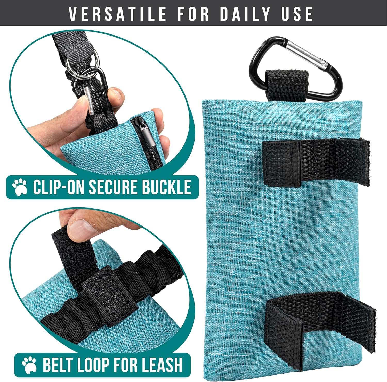 - DOG LEASH TREAT POUCH HOLDER: Multi-use dog walking bag can be used as a small dog treat pouch for training. Compact yet roomy enough to carry small pet supplies, essentials, and keys. Makes a great leash accessory to carry kibble for puppy training and obedience.