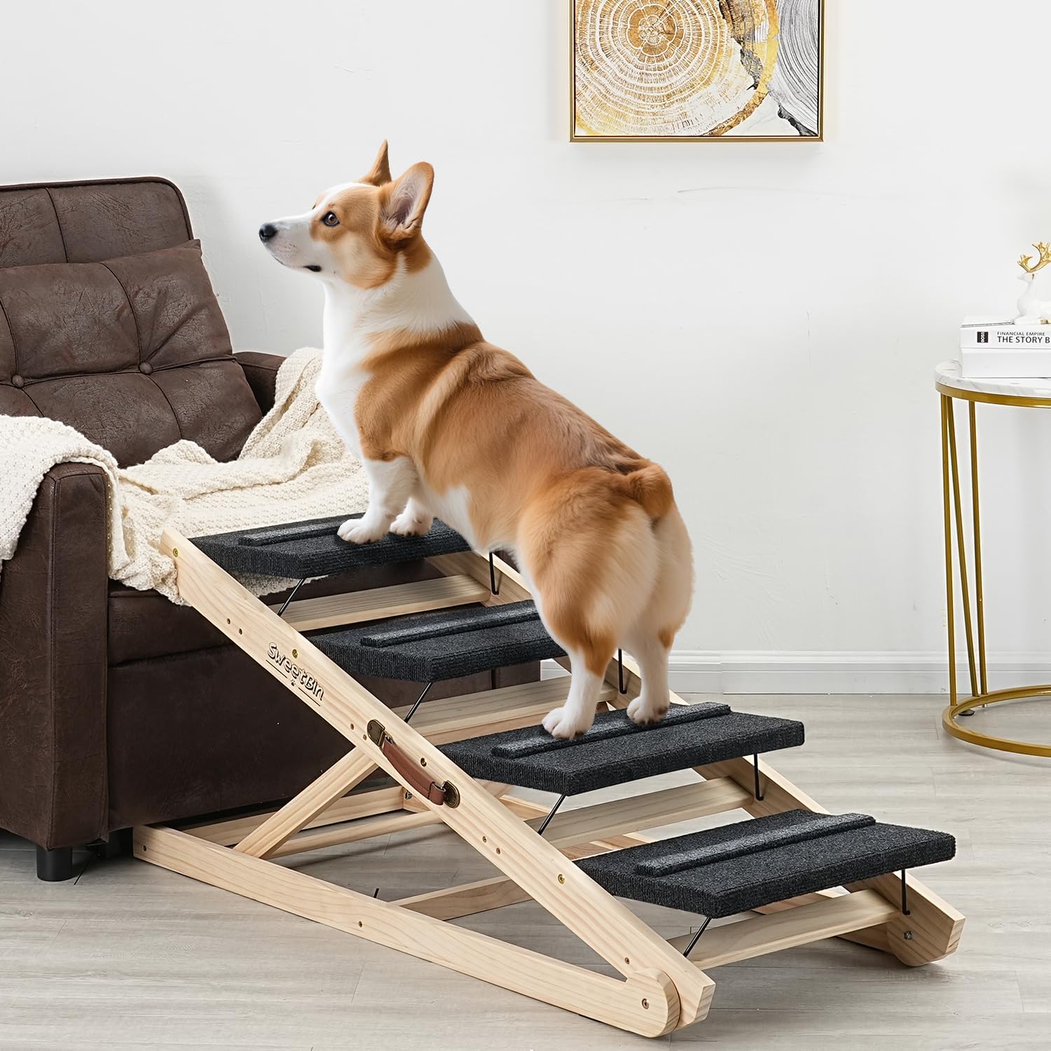 - ✅NATURAL MATERIAL & STURDY DESIGN - Crafted from pure natural pine wood, the dog stairs for small dogs features a smooth surface without any rough edges. Its mechanical design provides robust support, ensuring the stability of the ramp, capable of accommodating pets weighing up to 200 pounds.