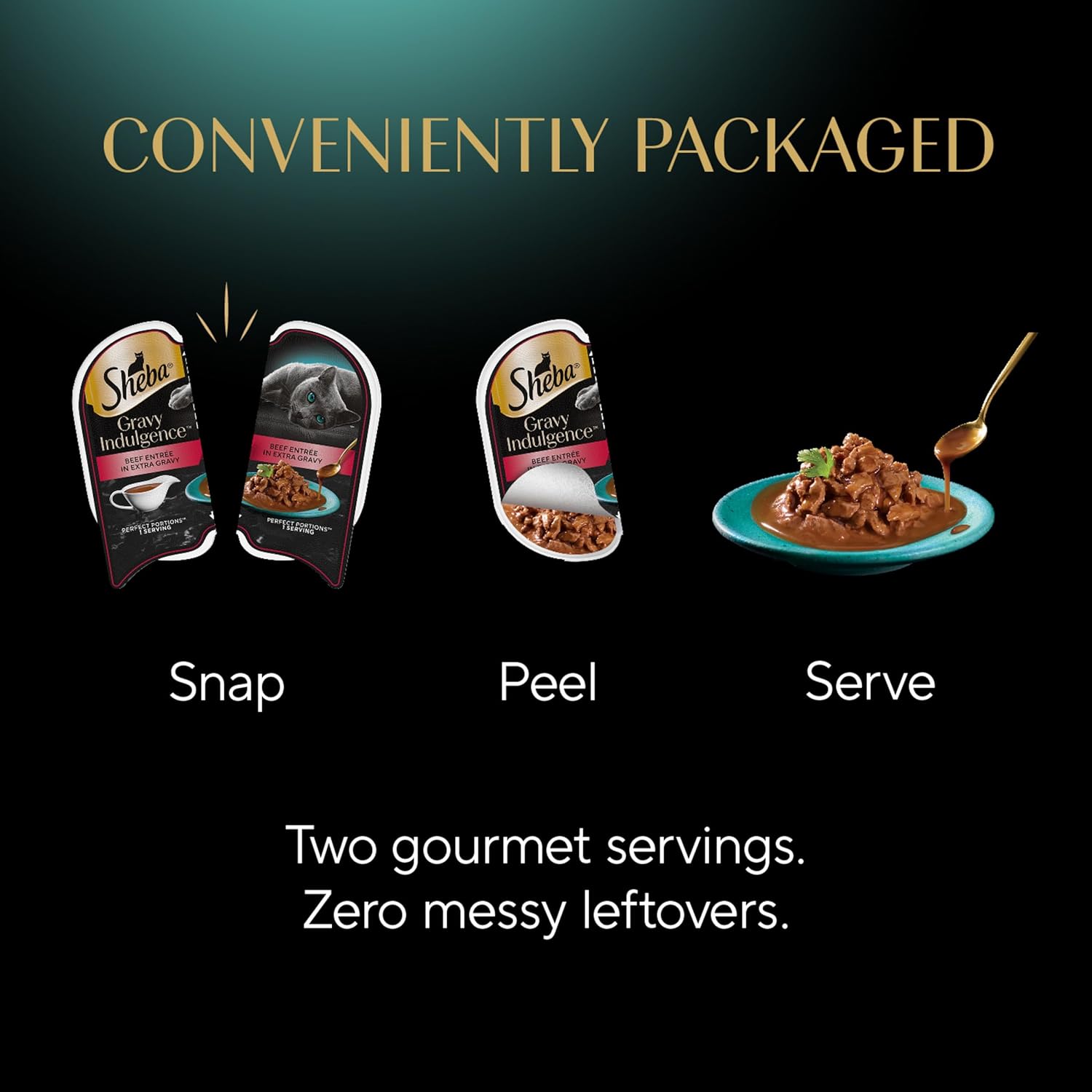 - Indulgent Recipe: Sheba Gravy Indulgence features cuts of Beef covered in a thick, decadent gravy your feline will love and love you for
