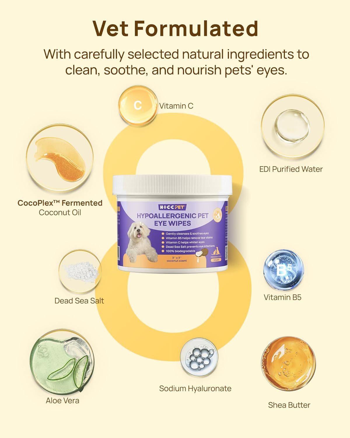 - 【Safe Ingredients】The Dogs Cats Eye Wipes are formulated with 7 natural extracts: Fermented Coconut Oil, Vitamin C, Vitamin B5, Hyaluronic Acid (HA), Aloe Vera, Avocado Extract, Dead Sea Salt. it can effectively clean the eyes, fade tear stains, remove odor, soothe and moisturize the delicate skin around the eyes, repair the damaged skin barrier, enhance eye resistance, and reduce the occurrence of eye problem.