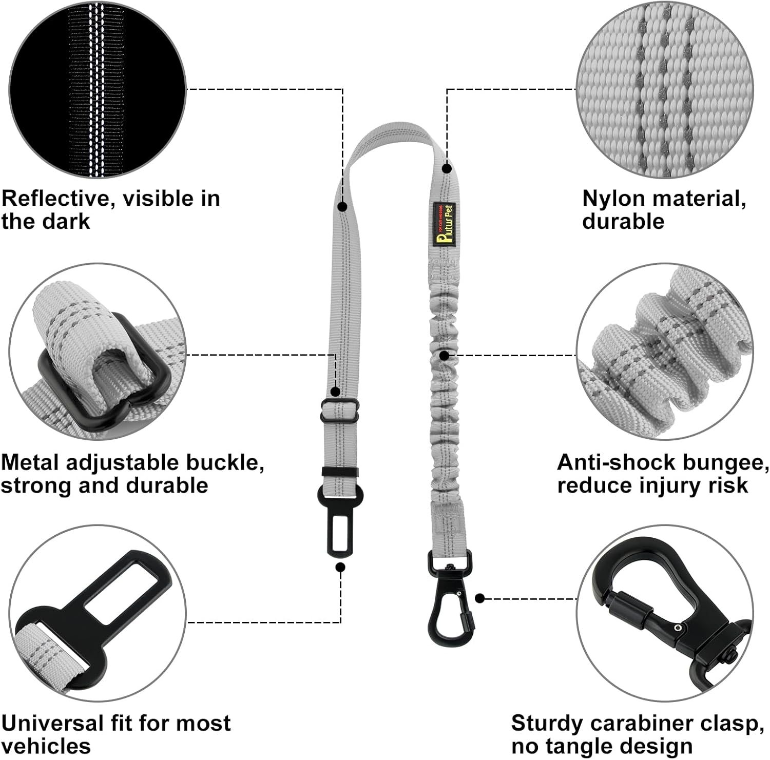 - Universal Buckle for Wide Vehicle Compatibility. Our seat belt features a universal buckle that fits most car models, ensuring hassle-free compatibility. Enjoy the convenience of using the same reliable seat belt across different vehicles. In an emergency, this seatbelt can be used as a dog leash, and the reflective strips increase visibility, making your dog easily noticeable in low-light conditions for added safety.