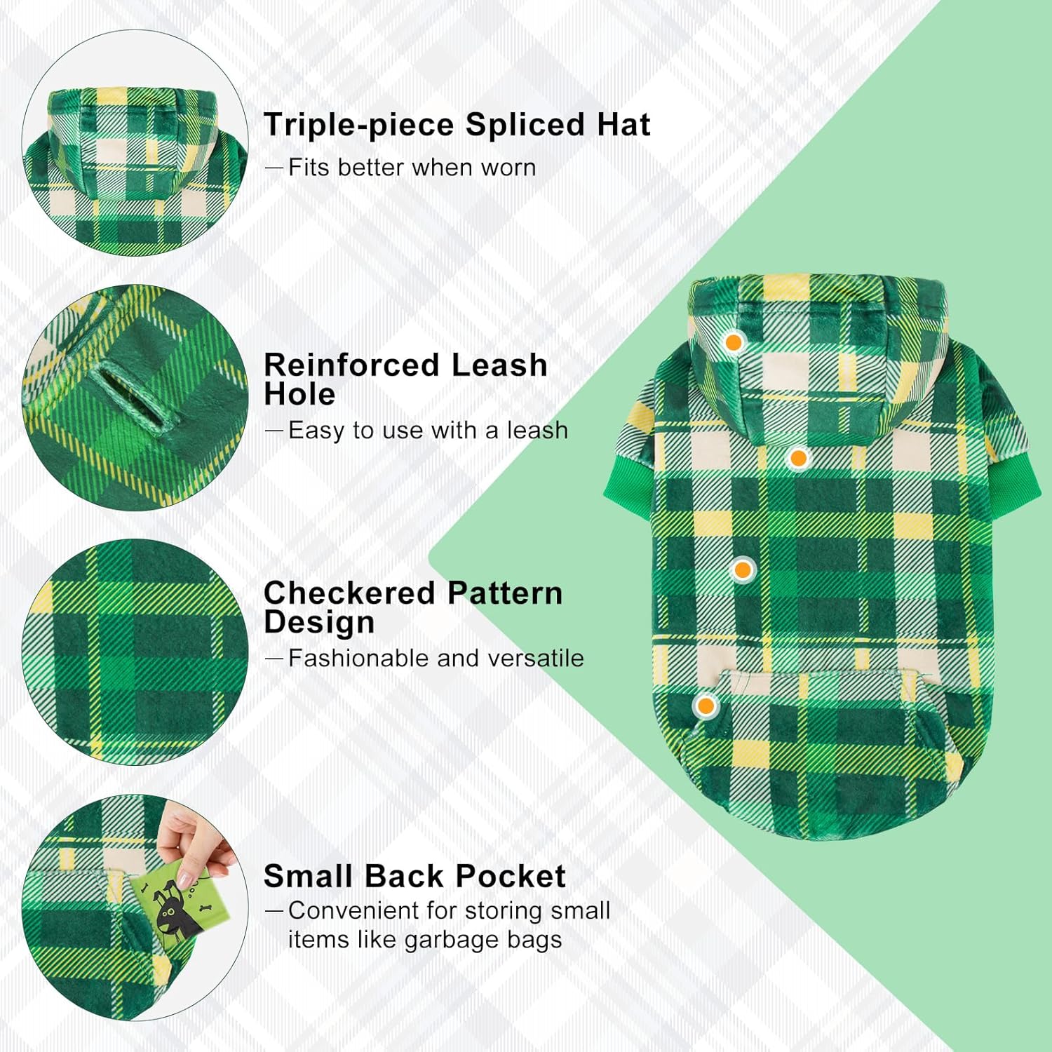 - Stylish & Practical Look: This plaid dog hoodie boasts a classic vintage check pattern that makes your pup stand out! Includes a handy back pocket for storing treats, toys, or waste bags. reinforced leash hole adds safety and durability—perfect for walks, running, hiking, training, or festive occasions like Christmas, Thanksgiving, photo shoots, and birthday parties.