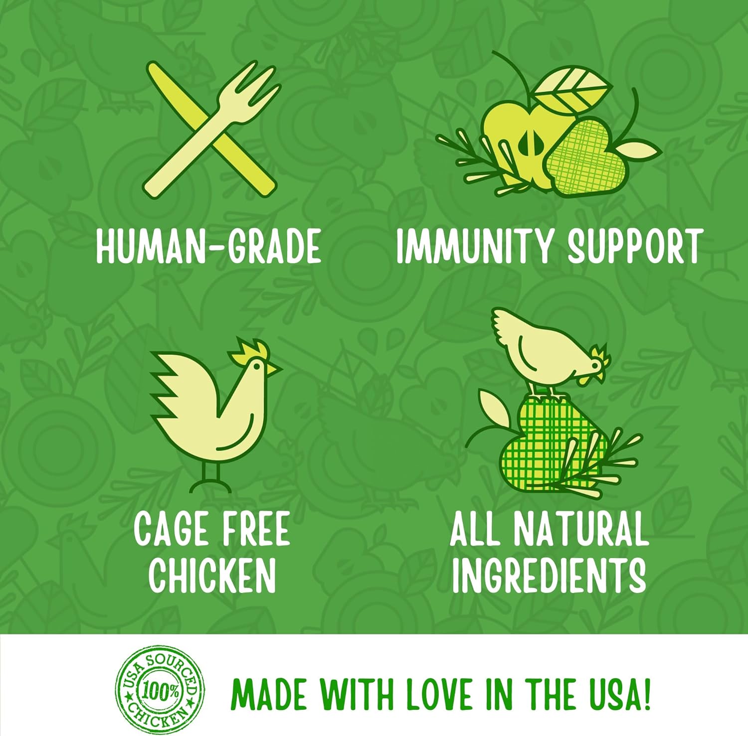 - HUMAN-GRADE: If you wouldn’t eat it, why would you feed it? From the ingredients they’re made with to the kitchens they’re made in, our treats meet strict USDA standards fit for human consumption.