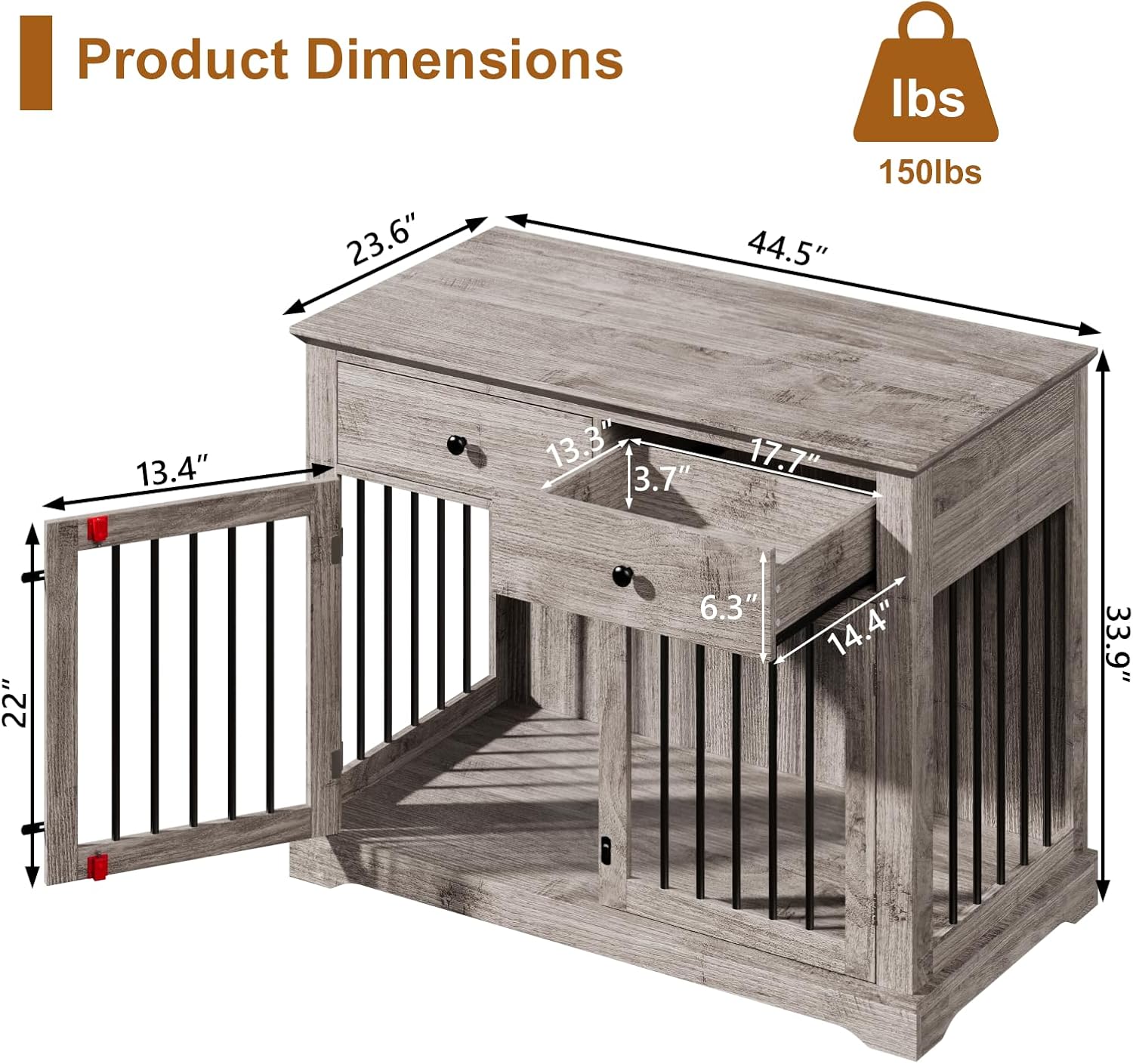 - PUKAMI Dog Crate: Overall Size: 44.5"L x 23.6"W x 34.5"H; Drawers Size: 13.4"L x 18.5"W. This furniture style dog crates can be serves as End Table,Display Stand, etc. Rustic color and appearance complement your home decor