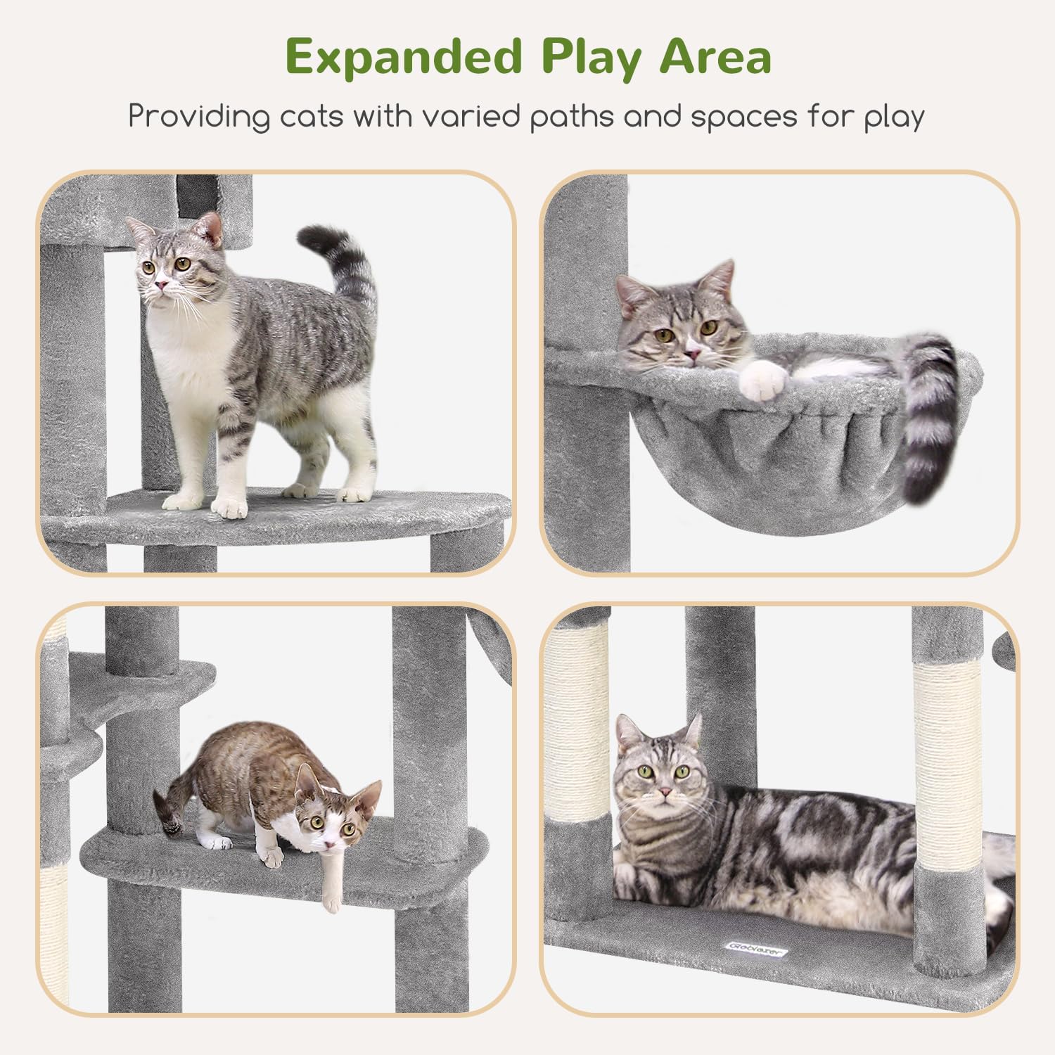 - ABUNDANT ENTERTAINMENT ELEMENTS: Tall cat tower featuring 9 natural sisal scratching posts, hanging mouse toys, and dangling balls, providing a comprehensive entertainment experience to meet all the needs of large cats.