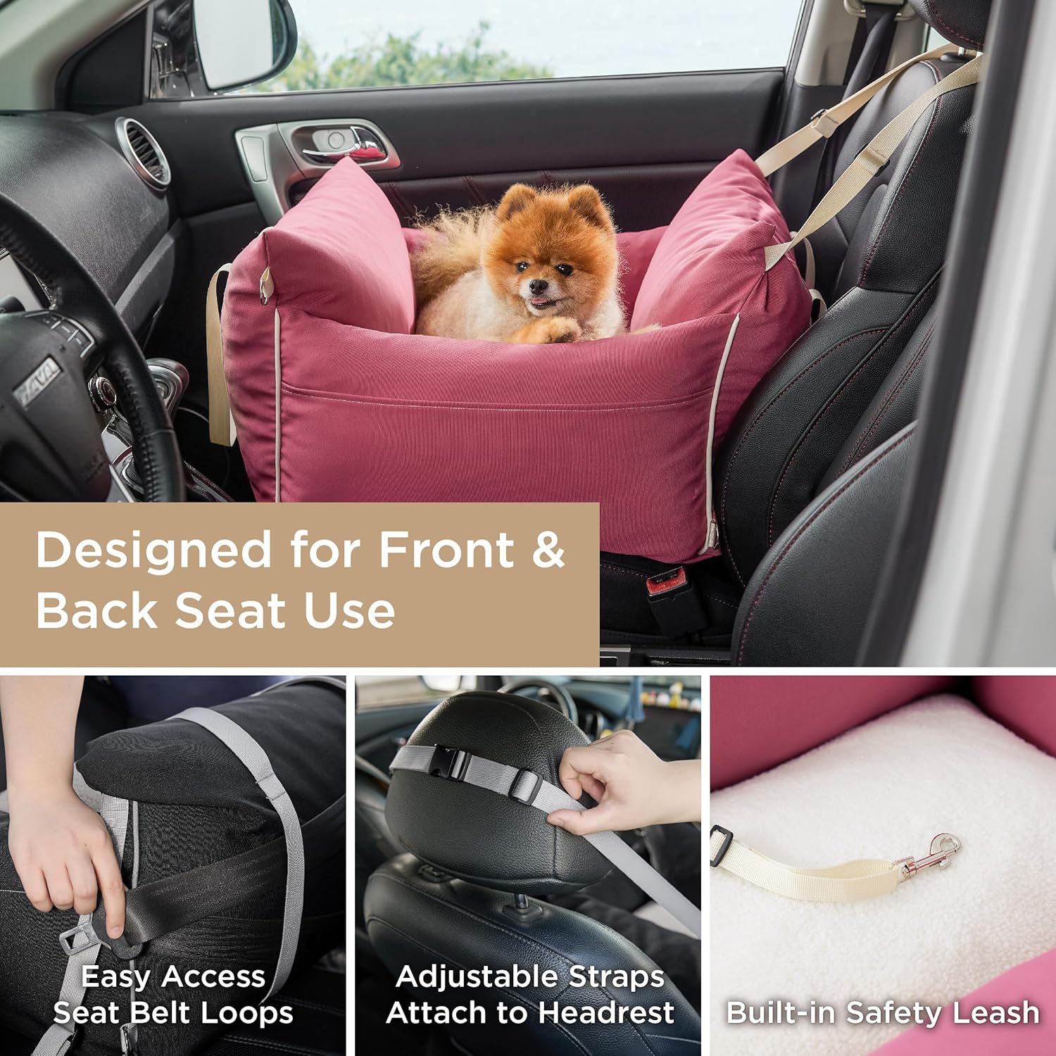 - Designed for Convenience: Great for all-season use in the car or as a travel bed, this booster seat's adjustable buckle design offers secure and easy installation. Simply fix the buckle to the headrest and adjust the length of the straps to fit your car. With the ability to use it in front and back seats, you can choose the best location for your pet. Large storage pockets on both sides offer ample space to store your pet's daily necessities.