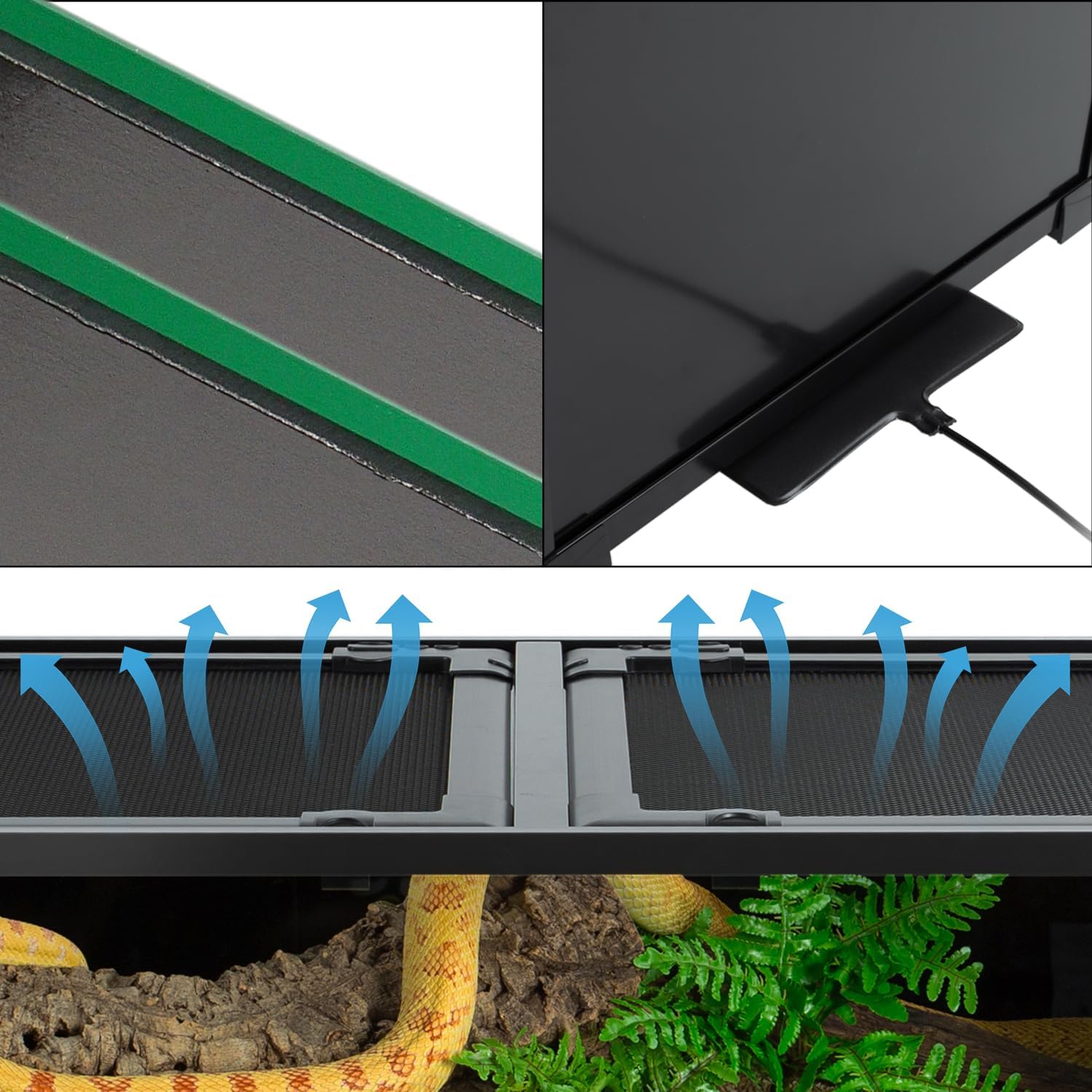 - 【Double Openable Top Cover】This black glass reptile tank has two openable mesh cover on the top, it's easy to feed your pet or clean the tank. Cable hole on the top for organizing messy wires easily.