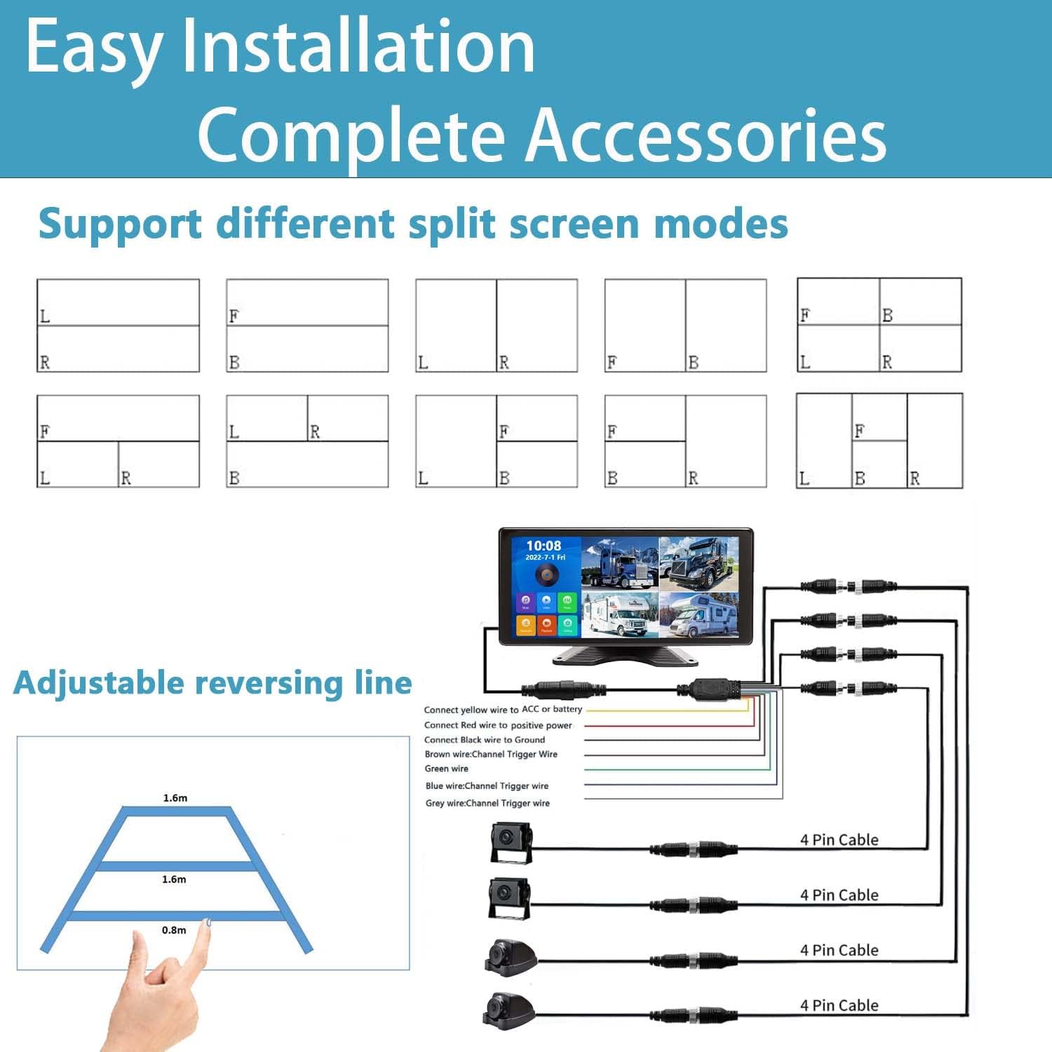 - Touchable 10.36 inch 4K Monitor:Wide 10.36 inch Screen,so we can observe 100% road situation.Larger screen,safer driving.2 split screen,2 channels,2 different angles help us to get a 360 degree view.For rear,parking, front, side,left,right,hitch,turn signal view.We also can choose the monitor to display 1/2 cameras' image.We can drive confiedntly.