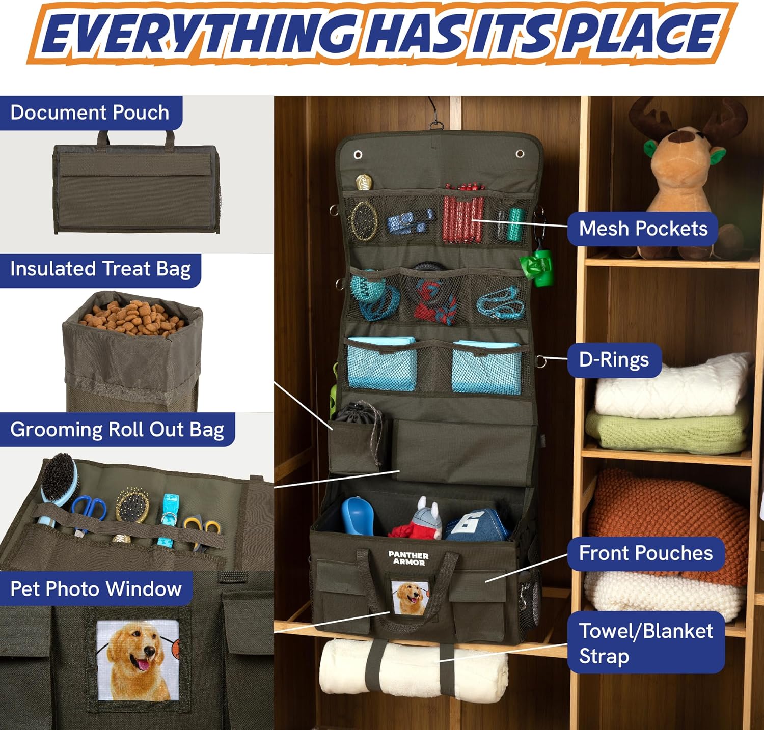 - Space-Saving Hanging Storage: Easily hang this over-door dog organizer on closet doors or in pet closets. Perfect as a closet organizer and over-door storage solution, providing ample space with multiple mesh pockets, D-rings, and secure compartments.