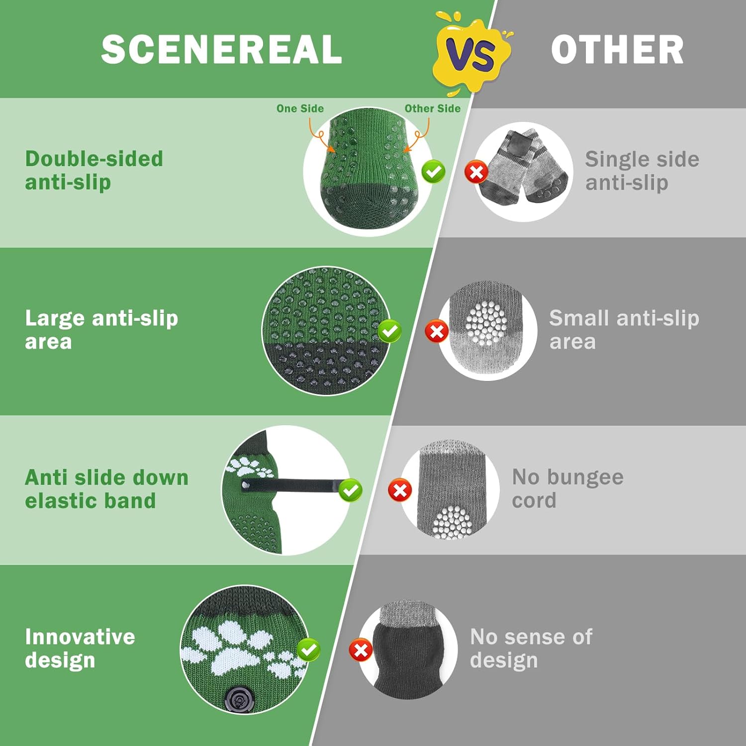 • BOTH SIDES & LARGE AREA NON-SLIP PET SOCKS: The dog grippy socks have a large adhesive on both sides, which provides your senior old dog with great extra traction and will not slip even when twisted. Therefore, if your furry friend has problems with his hind legs slipping on wooden floors, we recommend that you purchase these soles.