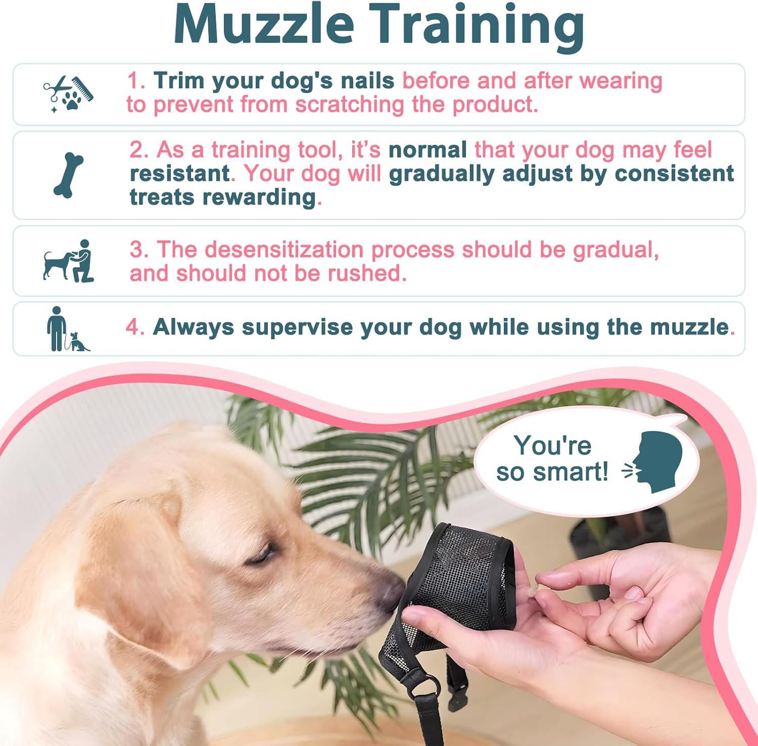 - Effective Muzzle Training Before Stress-Free Use: It’s normal for dogs to try to escape the muzzle when stressed or anxious. Muzzle training aims to make the experience positive through rewards like treats, reducing discomfort, fear, and escape behaviors. Follow the Video guide and Instructions step by step to maximize the muzzle's effectiveness. As dog owners, work through behavioral issues instead of using the muzzle to cover them up