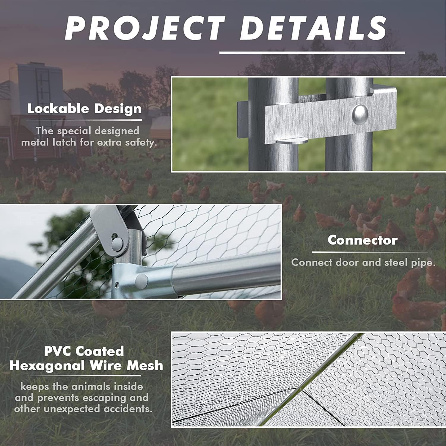 - Prefect chicken coops for backyard and Farm: Lockable steel door with a latch and steel wire ties for extra safety. the small gaps between meshes add safety to your chicken that prevent them from some predators,It also prevents chicks from escaping