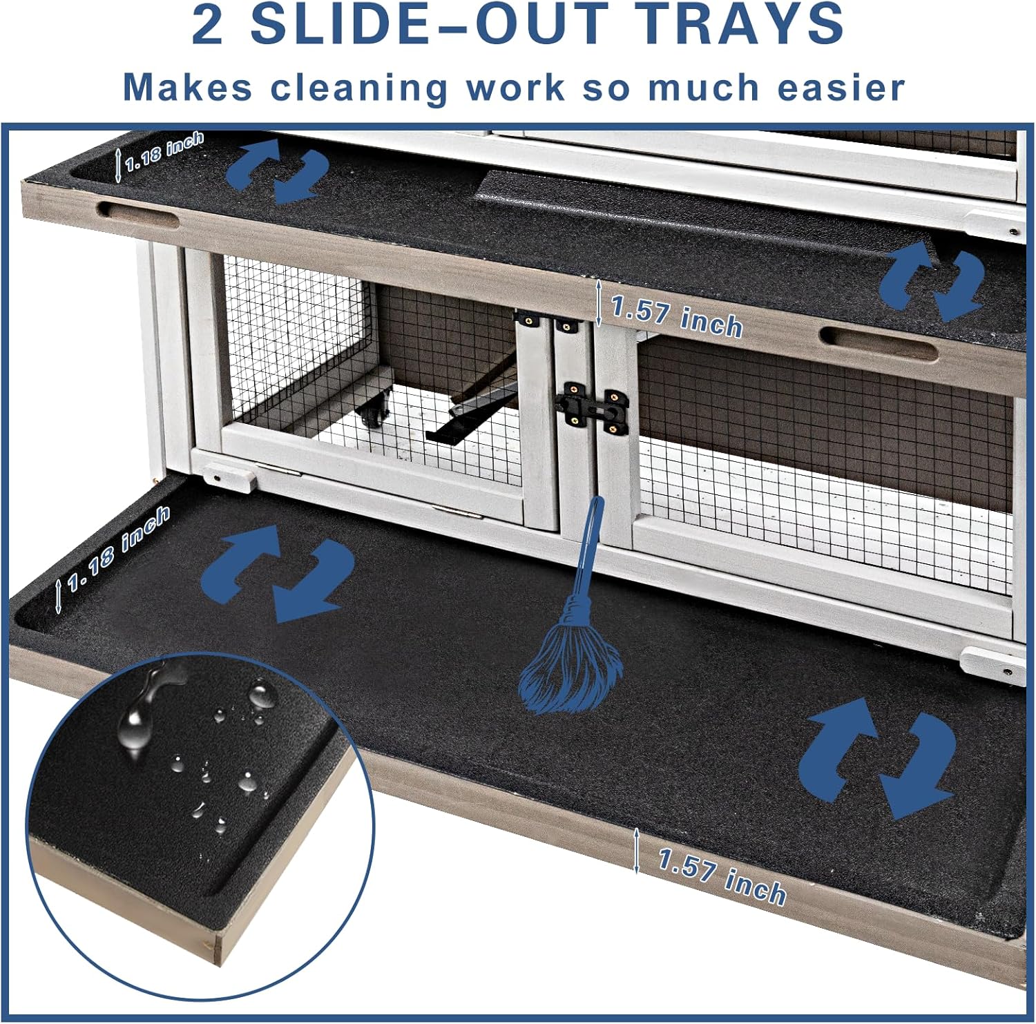 - ð¹ã2 PULL OUT TRAYS & EASY TO MOVEãSay goodbye to messy cages and hello to easy maintenance! The bunny hutch is equipped with two deep no-leak trays that simplify cleaning, ensuring a clean and healthy living environment for your pets. Featuring four lockable metal wheels, this rabbit cage is easy to move, allowing you to provide your pets with a change of scenery indoors and outdoors. Whether you want to bring them closer to you or let them enjoy fresh air and sunshine, this cage offers the flexibility you need.