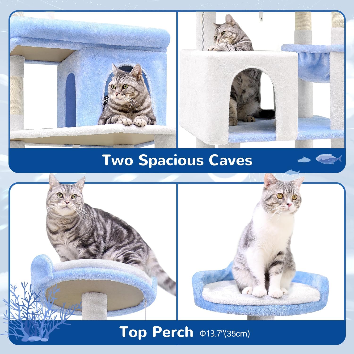- 2 CAT CAVES, 2 Styles - Equipped with two cat condos. The large cat condo provides cats with a private resting space. The high-level condo serves as a 'lookout' tower, allowing discreet observation of the surroundings.
