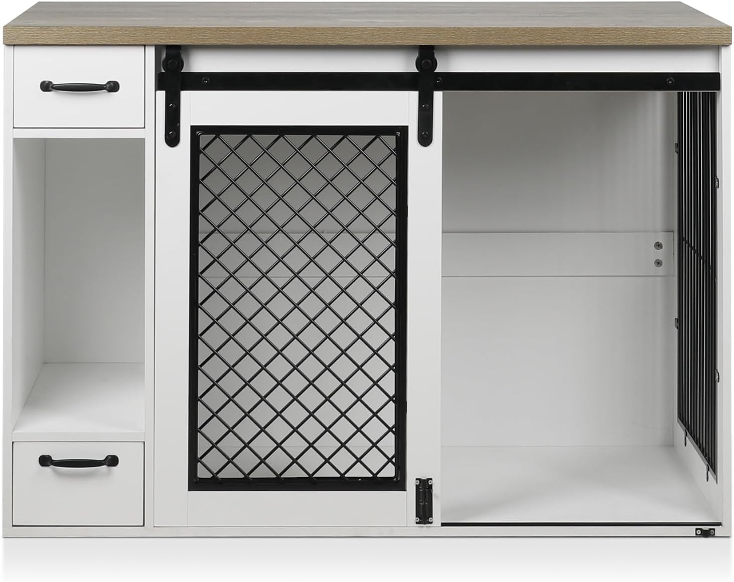 - 【Built-in Feeder & Storage】 The bottom drawer comes with double stainless steel food bowls that can be pulled out when feeding and can also be hidden to save space. Drawer and a spacious cabinet with shelf provide extra storage space for pet items such as dog toys, snacks, food etc. This dog kennel sideboard with drawers is functioning furniture for owners of small and medium-sized dogs, who apart from the comfort of pets, also care about the interior design.