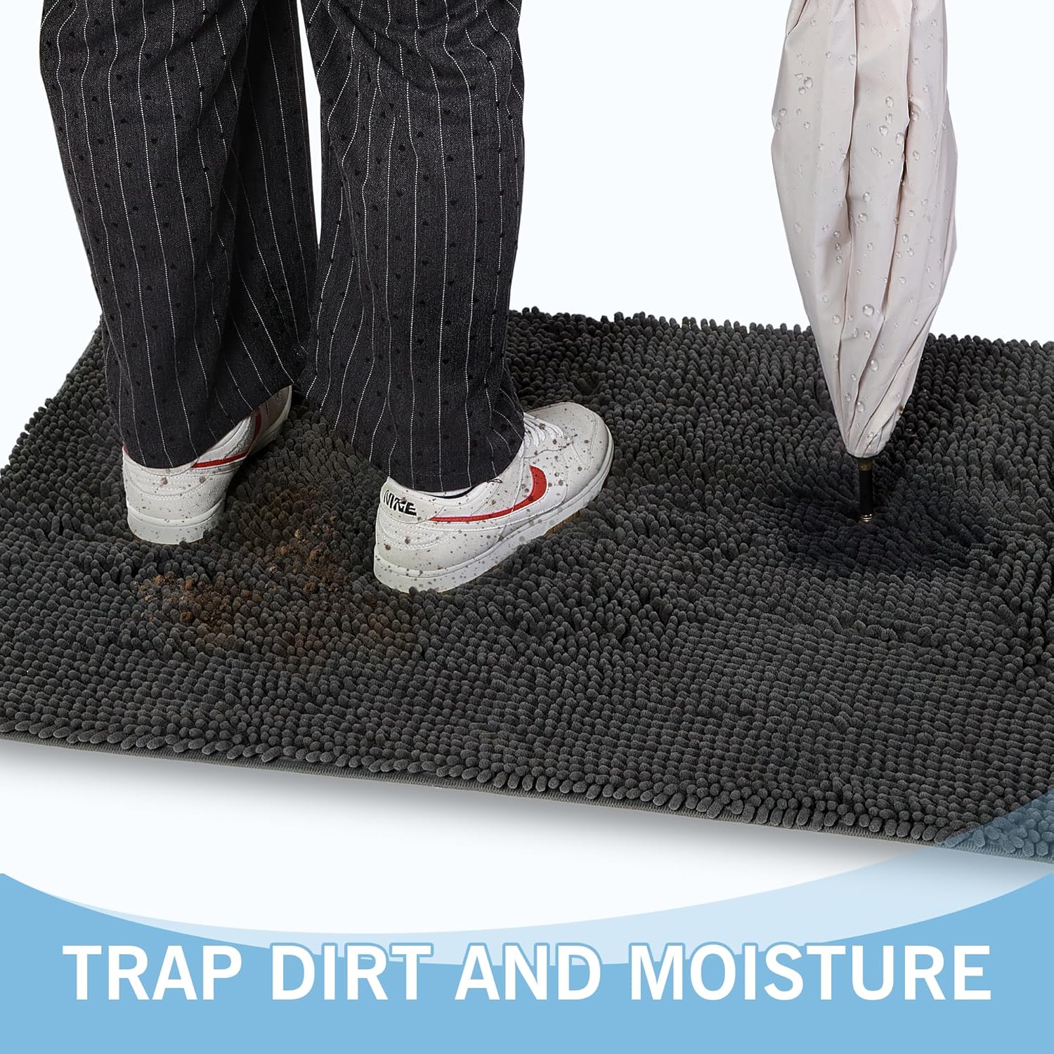 - Absorbs Moisture and Trap Dirt: With about 1" microfiber pile, this chenille dog mat for muddy paws absorbs excess moisture and effectively trap dirt. With our front door mat, your shoes will be spotless from water, dust, grit, mud, sand, sleet, grass, slush, rain, or snow when entering your house. A smart pick for a doormat that greets guests and traps debris, keeping your home's first impression shiny and clean.