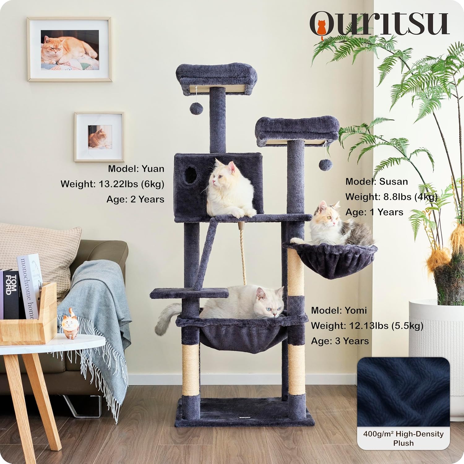 Ouritsu Cat Tree, 56 inch Tall Cat Tower for Large Cat Indoor, Large Condo, 2 Padded Perches, Steel-Framed Hammock, Scratching Post and ramp, Fluffy Basket, Dark Gray, LF001DG