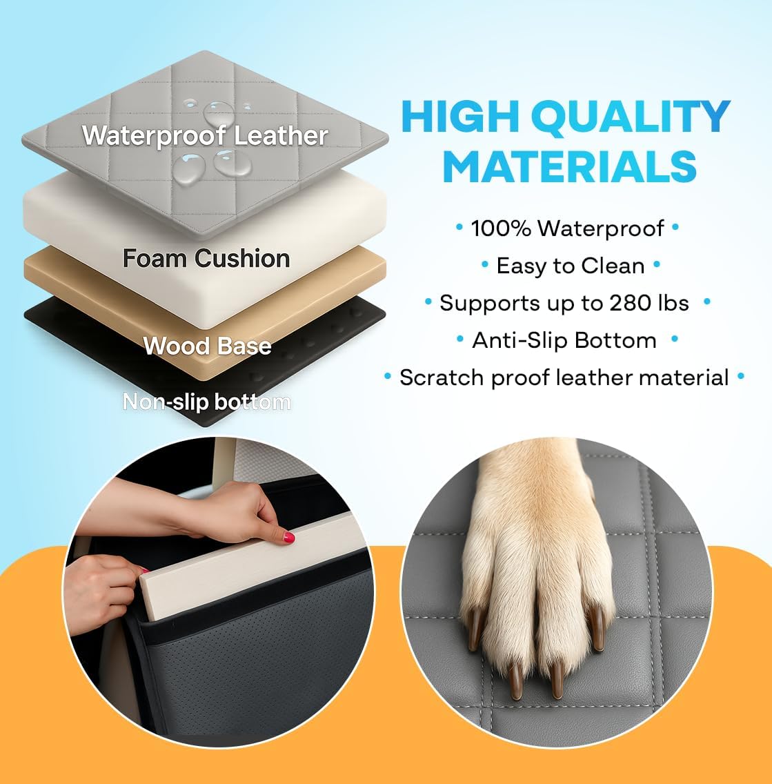 - Vegan Gray Leather with Door Protection: If you have a luxury vehicle, then you'll love the look of the upscale gray faux leather; This dog backseat cover also has door protectors for extra protection and 3 comfy, foam-wrapped plywood platforms that support up to 280 lbs