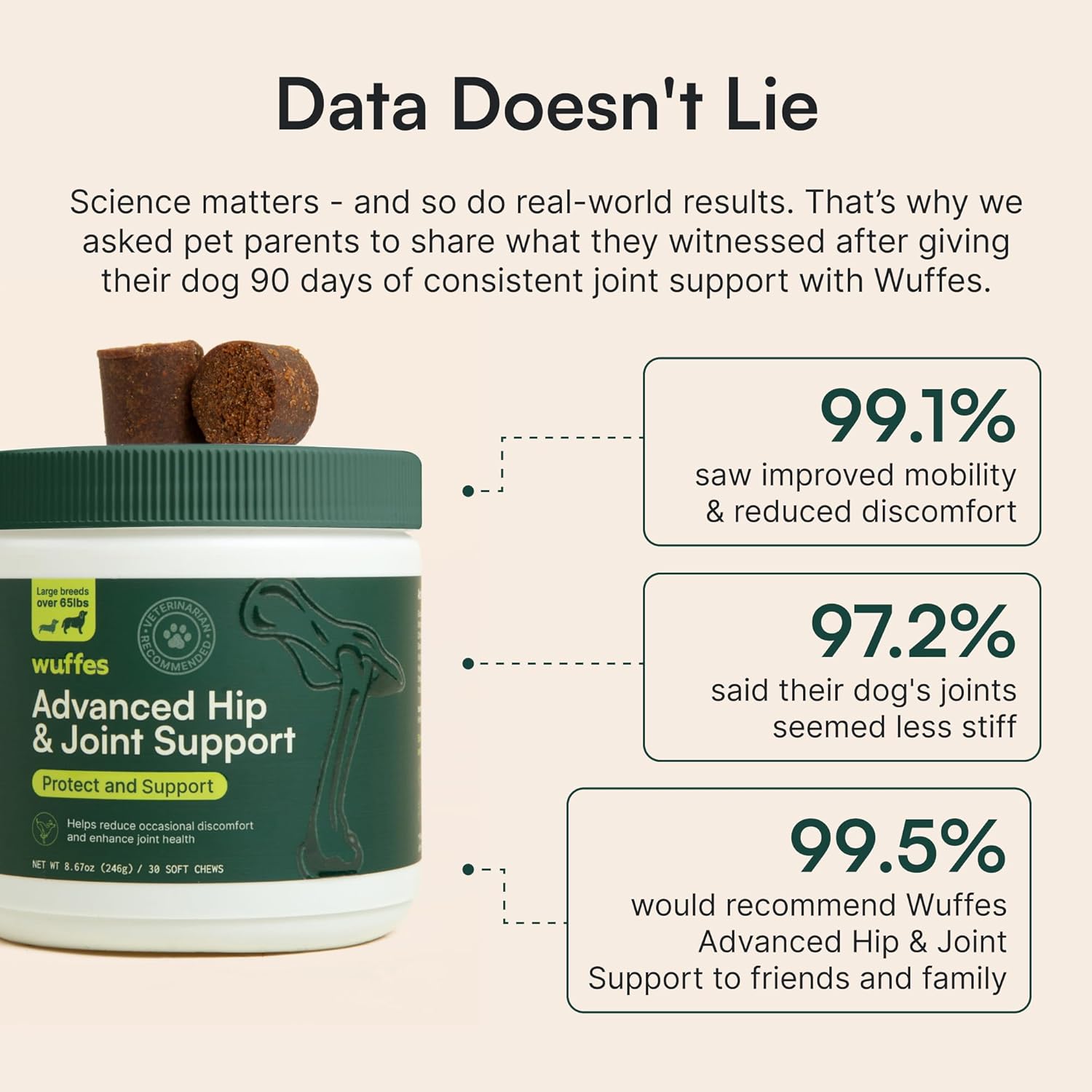 • Scientifically-Backed Ingredients: Expertly formulated by our in-house pet scientists, Wuffes Hip & Joint Support is made with ingredients known to help maintain healthy cartilage, promote joint integrity, and support long-term joint health.