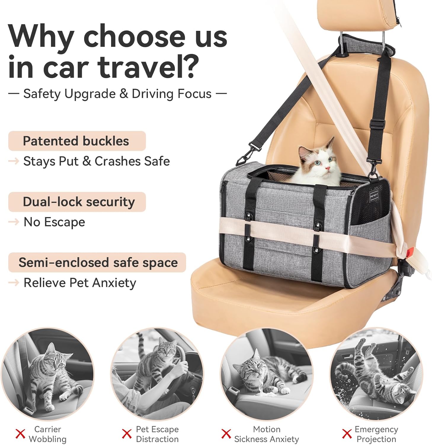 - Patented Safety Design: Featuring patented buckles and an adjustable clip-on harness, this cat carrier ensures stability during car travel. It also includes an anti-loss safety rope and a lockable zipper to prevent pets from jumping out and distracting the driver