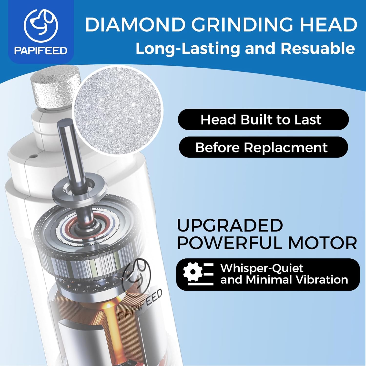 - 🐾【WHISPER QUIET&MINIMAL VIBRATION】With the latest mute technology and innovative powerful motor, the PAPIFEED dog nail file operates quietly, emitting less than 40 dB of noise. Additionally, the ergonomic body design of the dog nail trimmers reduces noise and vibration. By being exceptionally quiet and producing minimal vibration, these features help alleviate pets' fear and anxiety during the nail grooming process.