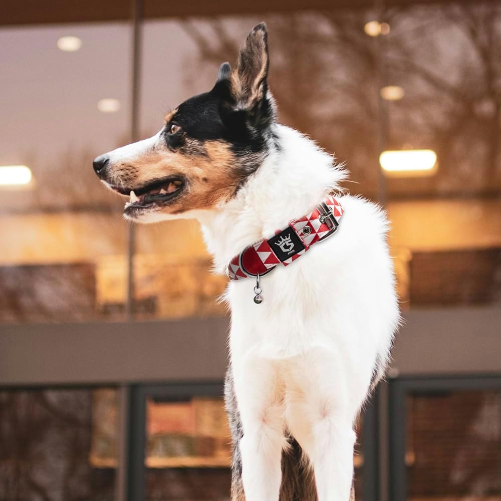 - Metal Collar for Dogs: The dog collars for small dogs with 4 adjustable points, easy to adjust the comfortable fit and attach to dog leash or dog collar. Please follow the size chart to measure your dog carefully before purchasing to ensure the halloween collar for dogs or christmas collar for dogs are fit well to your dog. For dog neck (L: 18.9”-21.7”, M: 15.8”-18.9”, S: 12.6”-15.8”)