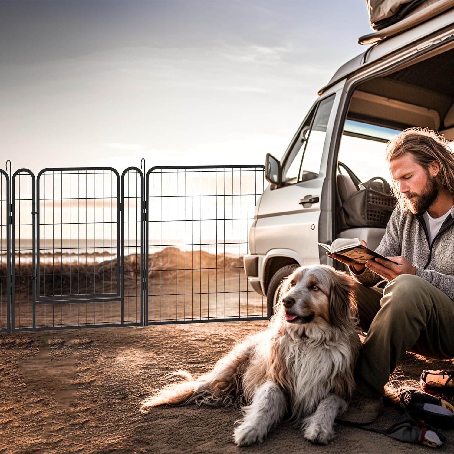 - 🐶𝗗𝘂𝗿𝗮𝗯𝗶𝗹𝗶𝘁𝘆 & 𝗦𝗮𝗳𝗲𝘁𝘆:This robust metal pet playpen is essential for dog lovers. It is coated with a rust-resistant finish and is non-toxic, ensuring it is safe and durable for both outdoor and indoor use. The automatic gravity lock on the gate secures your pet safely inside, providing a comfortable area for play and rest
