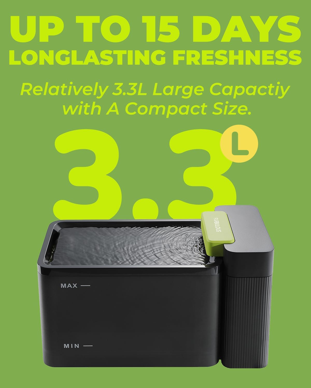 - LARGE CAPACITY: 3.3L(112oz) water tank provides up to 15 days of fresh water for 1 middle-sized cat, ideal for multi-pet households and frequent travelers (Note: Not for Heavy Usage/Large Dogs)