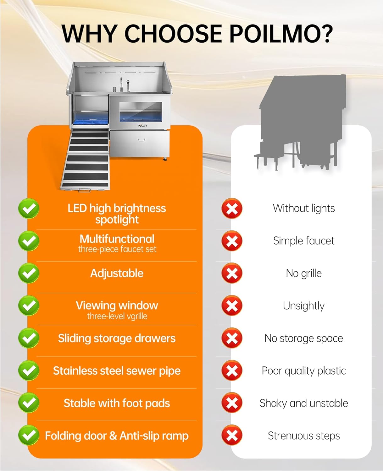 • Innovative and Practical Design: The POLIMO dog grooming station features multiple outstanding design elements: ① IP65 Waterproof high-brightness LED spotlight. ② Grade A tempered glass observation window. ③ The bathtub’s side panels feature a curved slide design, making it easier to operate④ Two-piece floor grid, adjustable to three different heights. ⑤ Sliding storage drawer for organized storage. ⑥ Multi-function faucet and showerhead, adjustable to left, center, or right positions.⑦ Two drainage options are available: one with a pet hair catcher and another stainless steel drain pipe featuring an odor-blocking S-trap design