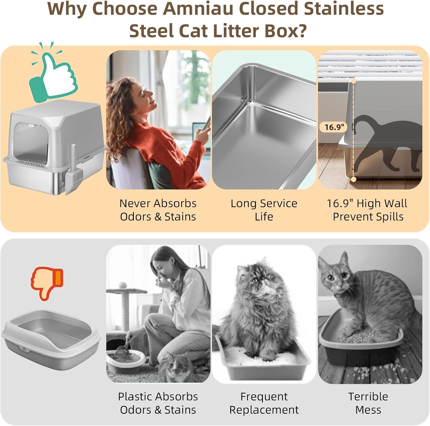 - DURABLE & LONG LASTING: The Amniau enclosed stainless steel cat litter box is engineered to last up to 5 years without losing shape. Unlike plastic, stainless steel reduces odor and is easy to clean, maintaining a cleaner environment with only 20 pounds of cat litter.