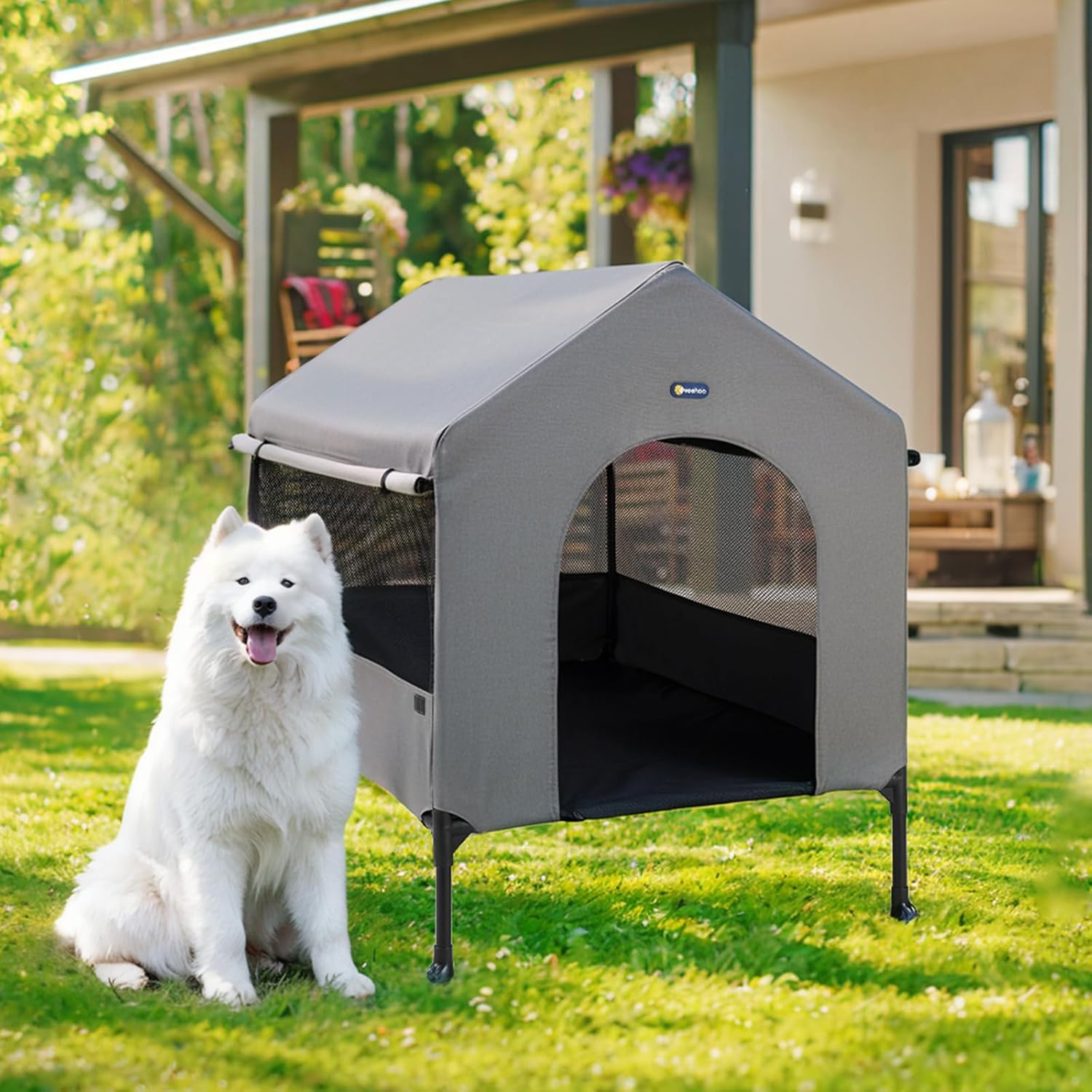 - 2-in-1 Dog House: The elevated dog house keeps your pet away from the cold and damp indoor floors and the outdoor environment exposed to wind and sun. Your pet can enjoy a comfortable rest time all year round, whether it's a sunny day or a windy, rainy one.