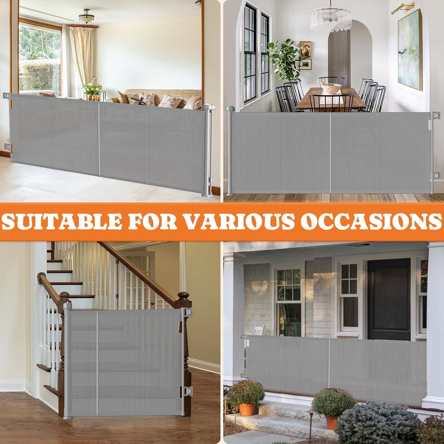 - Mesh Retractable Design: Extend our retractable baby gate up to 60" wide, with 35" heightened gates preventing pets from jumping out. Designed to save space, this dog gate is convenient when needed and easily tucked away out of sight when not in use