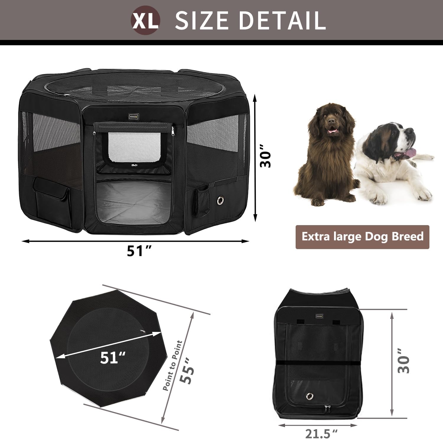 - 【DIMENSIONS】 Playpen Size: 55”(Diameter) x 30" (Height); Panel Size: 21.5"W x 30" H; Door Size: 16.5" W x 23" H; Mesh Cover Diameter: 44". (Manual measurements, please allow +/- 2cm difference!!!) Roomy 8-Panel design dog exercise pen with removable zippered top and bottom, washable 600D Oxford fabric and mesh panels make the cleaning easier. Spacious interior gives your pet room to play in the pen.