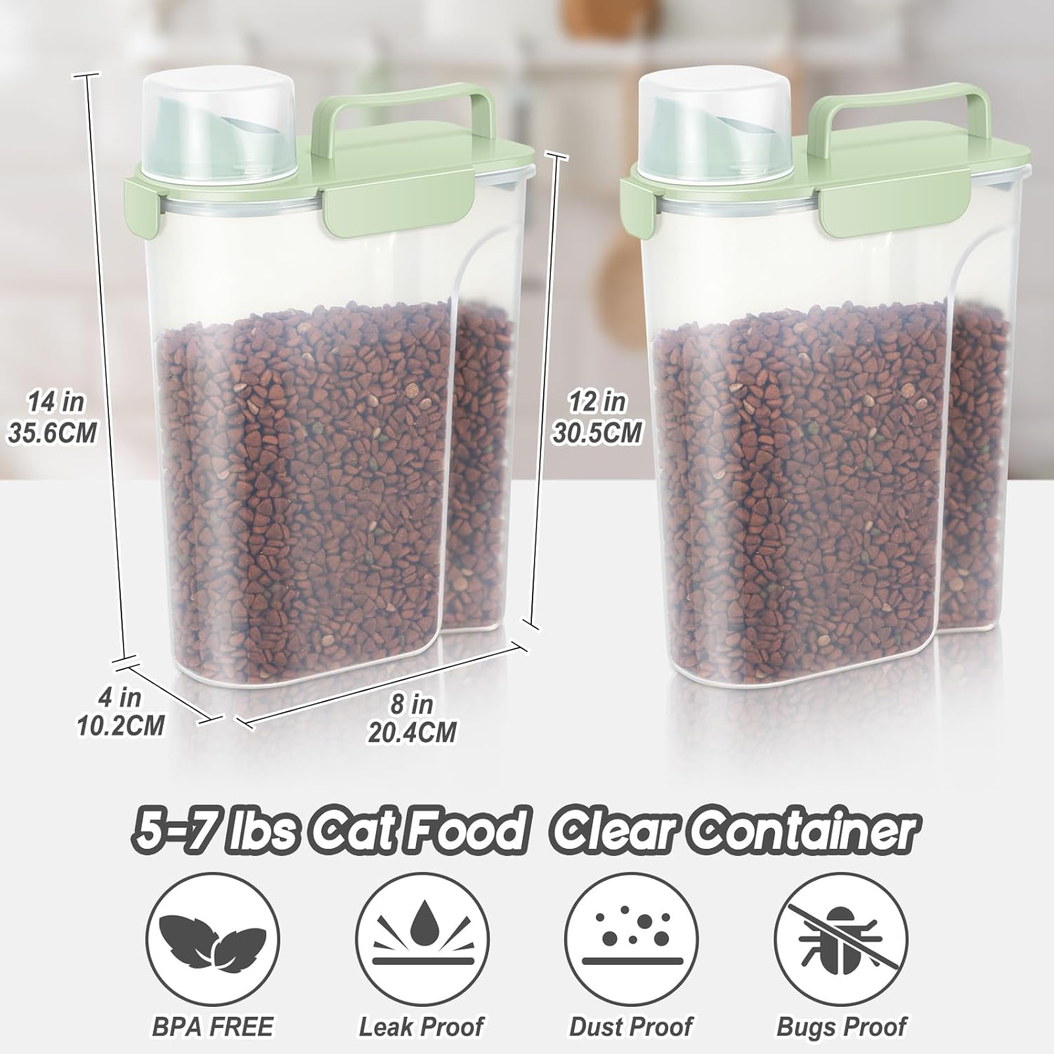 - SUPER LARGE CAPACITY : The airtight cat food container is designed with a large nozzle, so whether it is small or large pieces of food, it can be easily poured out without shaking the barrel. The handle design makes it easy to use and carry indoors and outdoors. It is also convenient to hold with one hand and tip the bucket to pour out food. The size of the pet food container is 14*12*8 inches, with a capacity of 5 liters. It can store pet food for 5 -7LBS, rice, dry food, cereals, etc. is about 10LBS, depending on the size and shape of the food. Can be easily stored and effectively save valuable space whether indoors, outdoors or during travel.