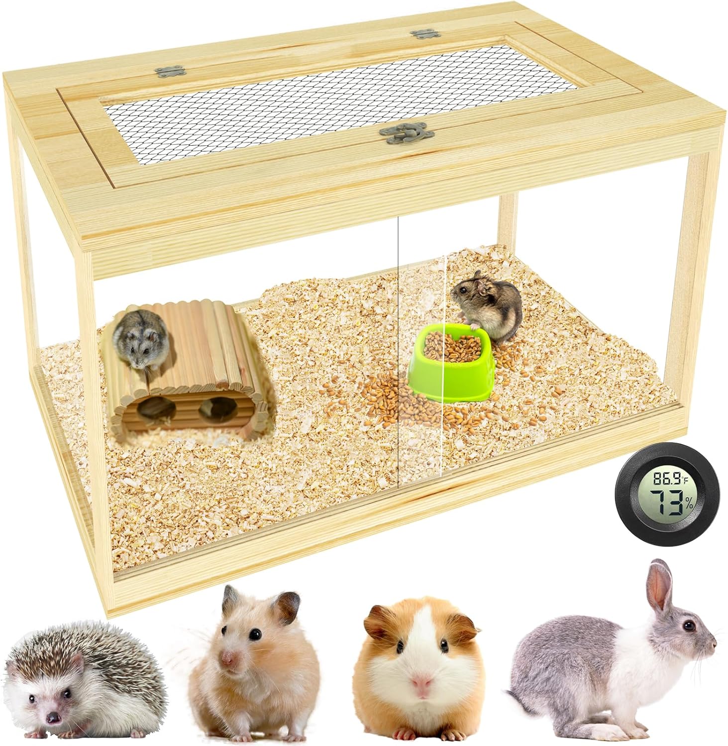 - Efficient ventilation: The dwarf hamster cage ensures efficient airflow and ventilation. Equipped with an openable metal mesh top cover and sliding door, it effectively promotes air circulation. Additionally, it includes a hygrometer to monitor humidity and temperature, providing ideal living conditions