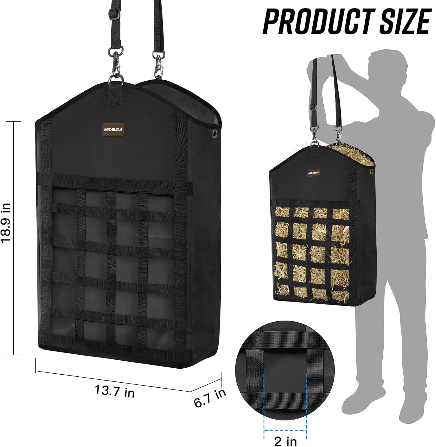• Premium Material:The hay bags for horses is crafted from premium 600D oxford cloth, ensuring exceptional strength and durability. The tight stitching enhances its resistance to wear and tear, making it highly resistant to being torn or bitten by pets. Rest assured, this hay bag is built to last, providing you with a long service life.