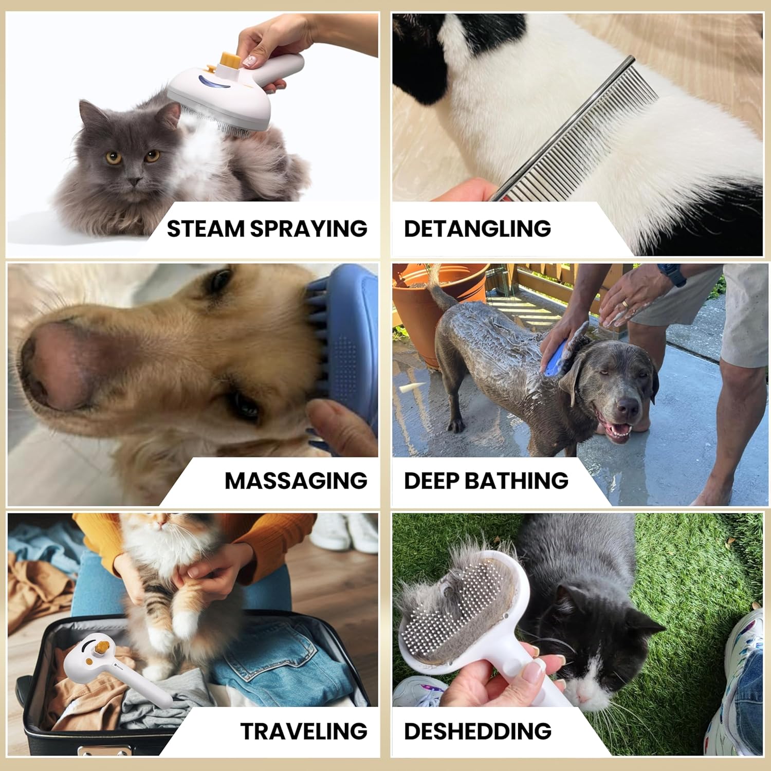 - [4-in-1 Dog/Cat Steamy Brush]: Our pet steam brush combines grooming, self-cleaning hair removal, steam spray, and anti-static features to help you easily address a variety of concerns. The steamy slicker brush for cats and dogs effectively removes tangled and loose hair, helping to prevent flyaway hair. (Note: Our pet steamy brush only converts water into spray and does not heat it.)