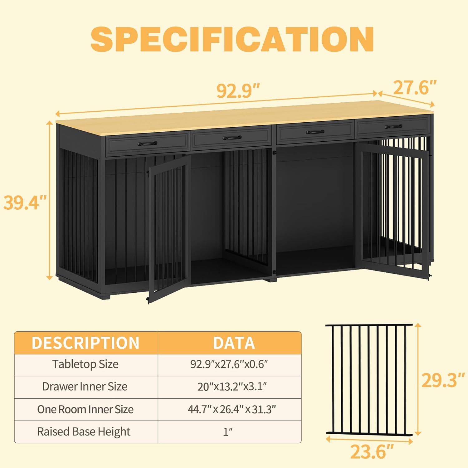 - For All Breeds Dogs: The overall size of the dog crate furniture is 92.9" X 27.6" X 39.4", the inner size of each room is 44.7" X 26.4" X 31.3", which makes it very spacious for large dogs. Remove the divider and place a soft and thick cushion, your large dog can also rest inside comfortably