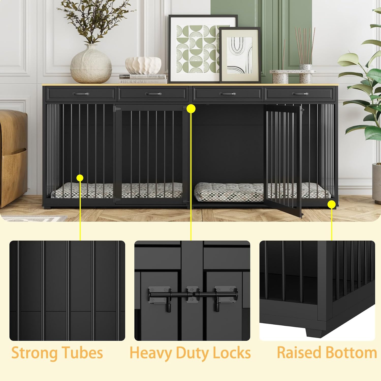 - 2 Dogs Crate: Our large dog crate furniture is designed with two separate rooms. Dog kennel table solves the concern of having two dogs in the house and can provide a separate private space for the dog without crowding. The interior of the indoor dog house is super big, the middle divider can be removed, large dogs can also feel comfortable and spacious. Each door has two latches, making it difficult to open the door to escape