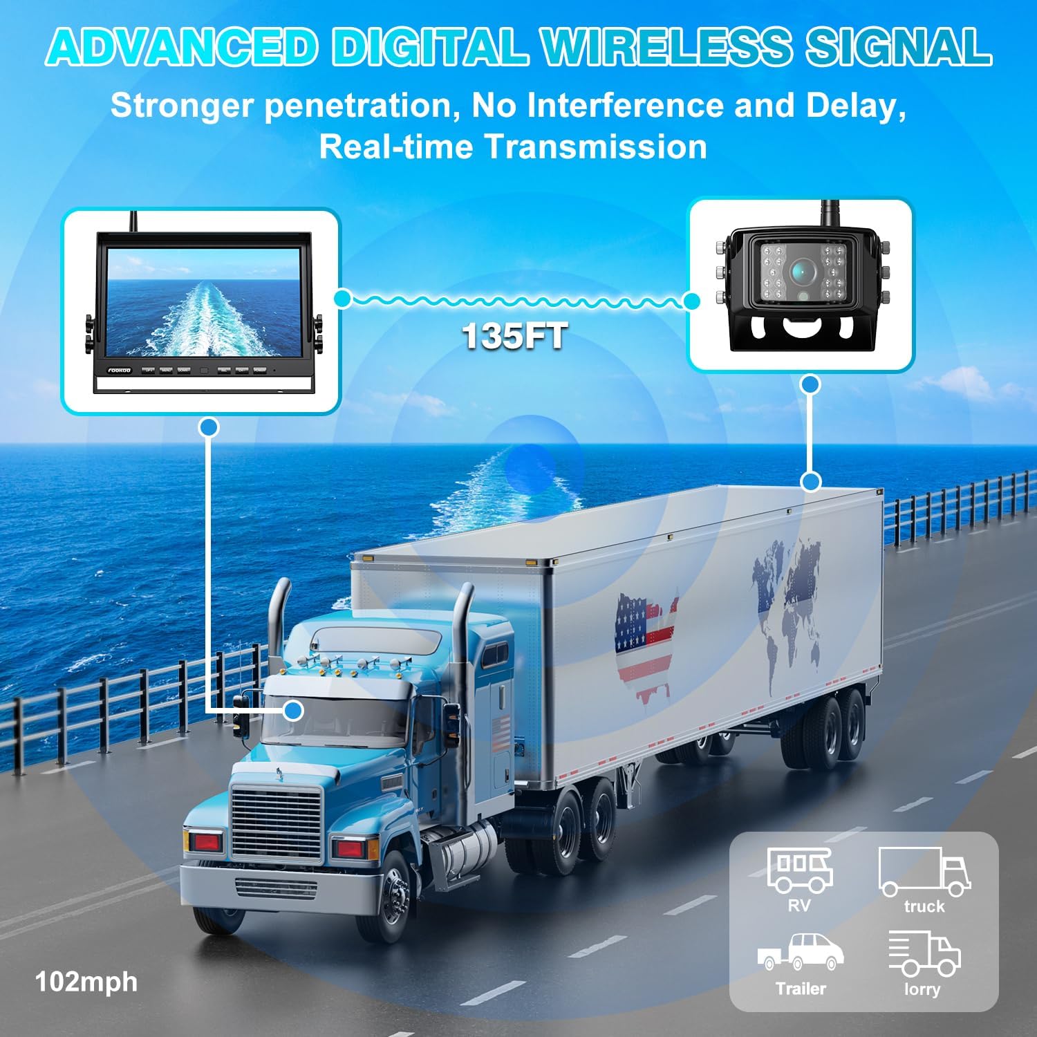 - 【Advanced Digital Wireless Signal Tech】The system has a stable digital signal technology that works up to 128 feet in open areas and is enough for any large vehicles. Even at speeds up to 102mph, the monitor will show you what's going on around you in real time, making your driving easier. No interference, flicker, blur or delay.