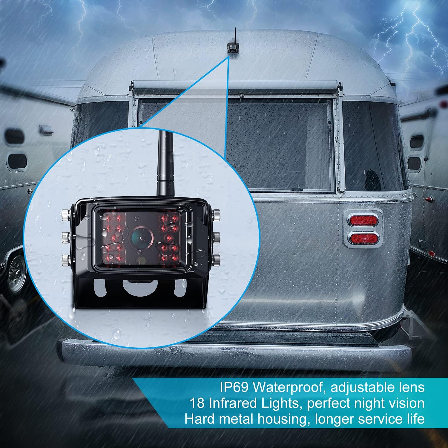 - 【Waterproof Cameras with Night Vision】The IP69 waterproof camera works perfectly in any extreme weather. With 18 infrared lights, the camera will give you a high definition view of the night. The camera lens can be adjusted up and down, allowing you to view from different angles. The hard metal case allows the camera to be used for a longer period of time. (It can work with Furrion pre-wired RV, please ask us for the bracket adapter.)