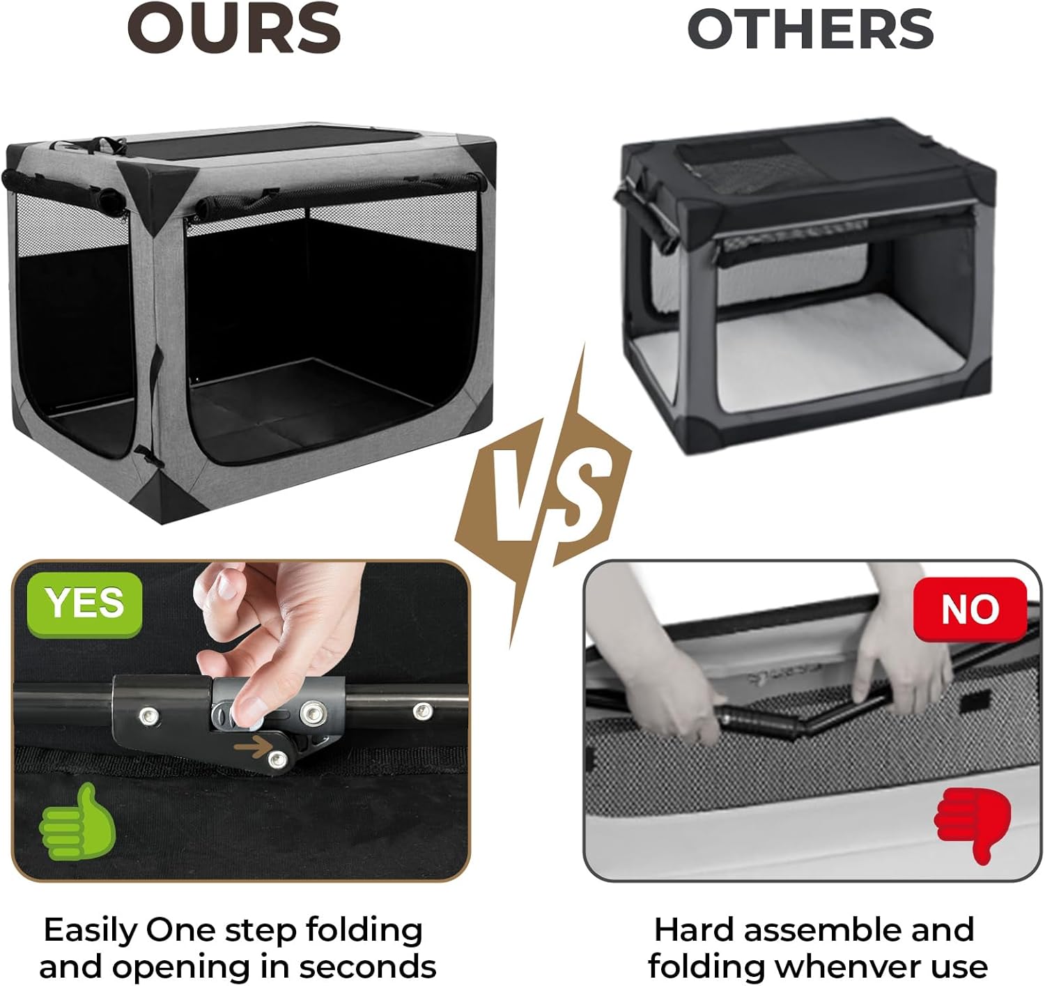 - Only Minutes Setup – Store Anywhere, Clean Everywhere "Assemble this portable dog crate faster than folding a lawn chair – no tools, no hassle. Wipe muddy paws or spills with a damp cloth. The foldable dog crate collapses slim enough to stash under beds or car seats."