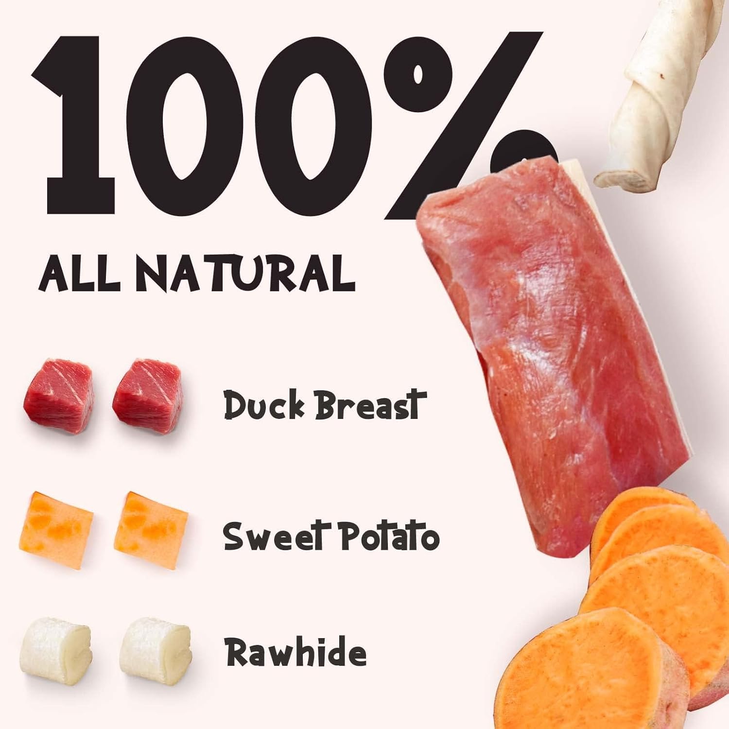 - 3-In-1 DOG TREATS : Made of human-grade duck for dogs as the very first ingredient which wrap with real beefhide and sweet potato inside.