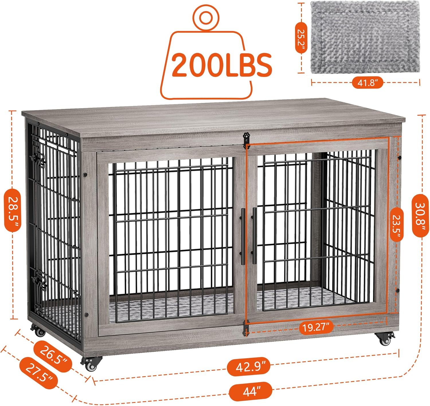 - [Choose the Right Size] The dimensions of the Large dog crate are 44"Lx 27.5"Dx 30.8"H. Inside dog kennel ideal for medium or large-sized dogs weighing up to 80 pounds (such as a Golden Retriever, Labrador Retriever, German Shepherd, etc). You can easily move it anywhere, the wheels have two casters that can be locked to prevent accidental slipping.
