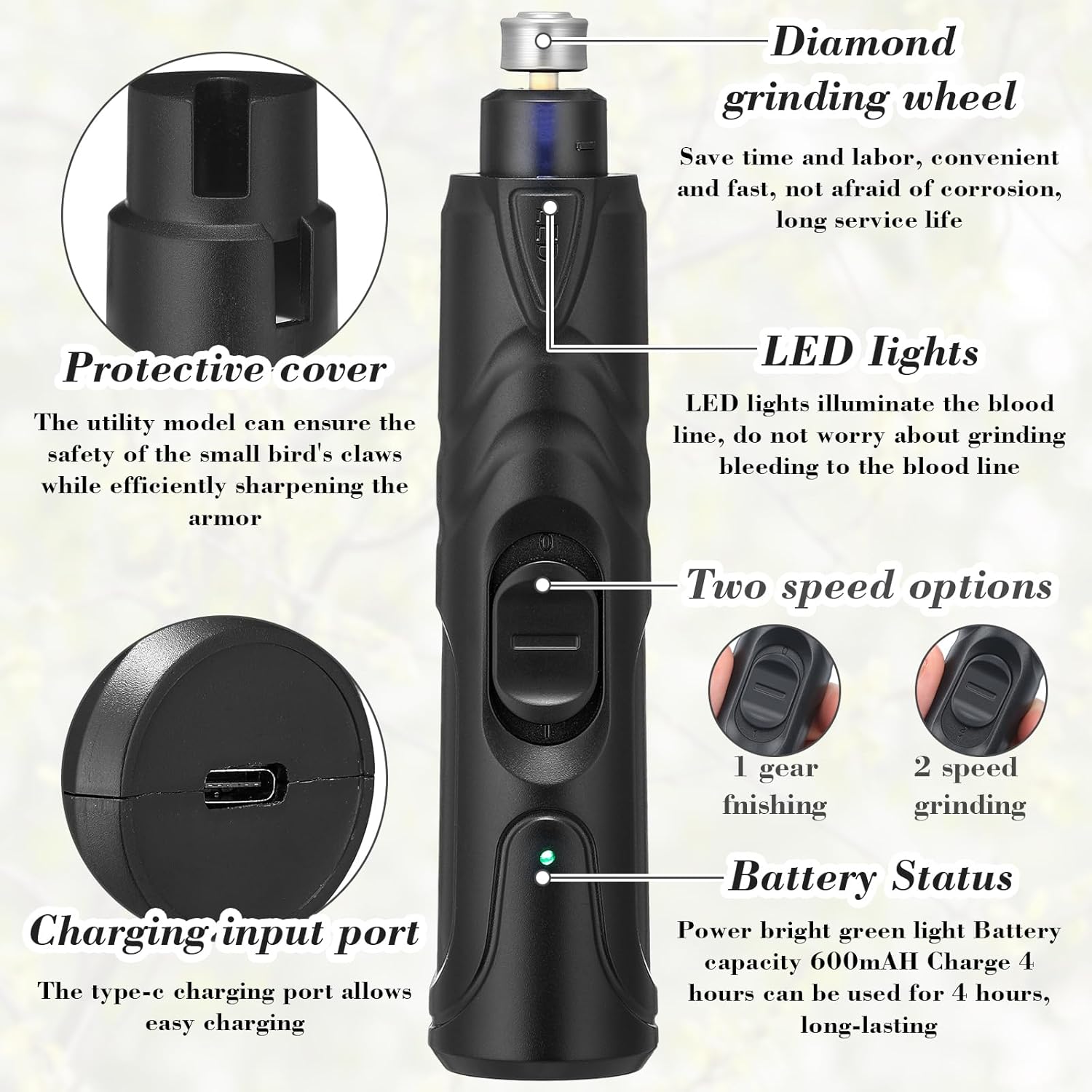 • Safe Nail Trimming Experiences: with a fitted LED lamp, this bird nail grinder gives you improved visibility for precision grooming; This feature helps you clearly find the blood line of the bird's nails, avoiding accidental harm during the grinding