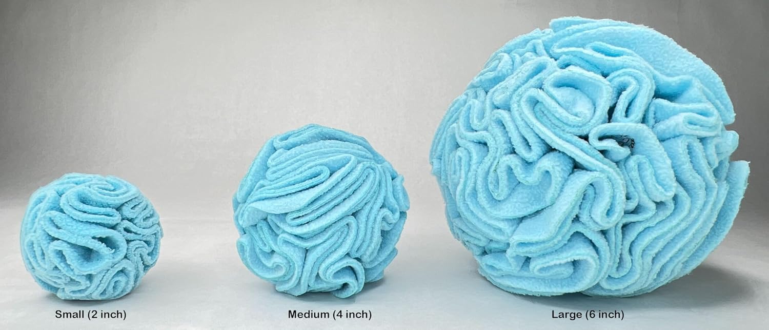 • Interactive toys engage pups in a way that requires action, decision-making, and responses. This snuffleball entices dogs, using their sense of smell, to find hidden treats within the folds. By stimulating their curiosity and rewarding them for their foraging behavior, the toy encourages dogs to actively search and solve the puzzle, providing both mental and physical interaction during playtime.